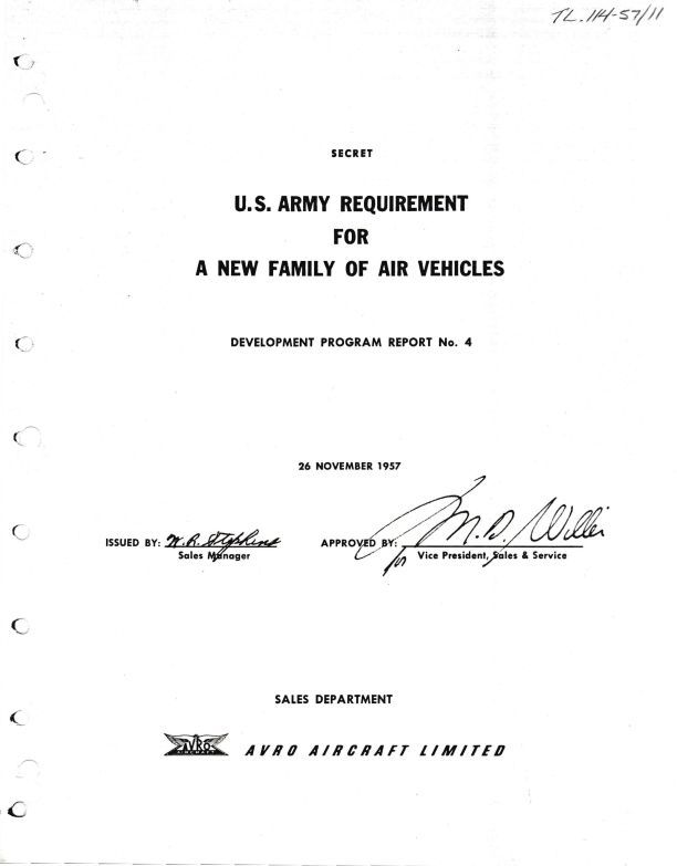 U.S. Army Requirement for a New Family of Air Vehicles Avro Proposal to the US Army Requirement for a New Family of Air Vehicles. Proposal discusses Significance, Competition, Avro Design, Relation to Existing Programs (Project 1794, P.V. 704, System 606A). Report approved by M.D. Willer