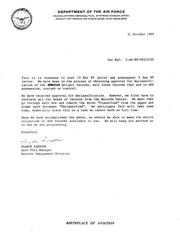 Letter from Department of the Air Force, Headquarters Aeronautical Systems Division (AFSC) Wright - Patterson Air Force Base - regarding declassification of the Avrocar