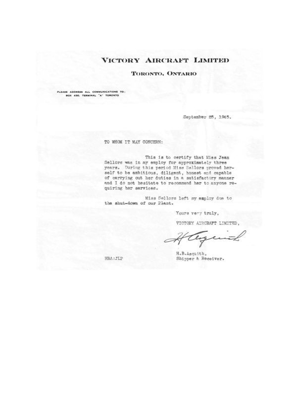 Victory Aircraft Limited Reference Letter for Jean Sellors