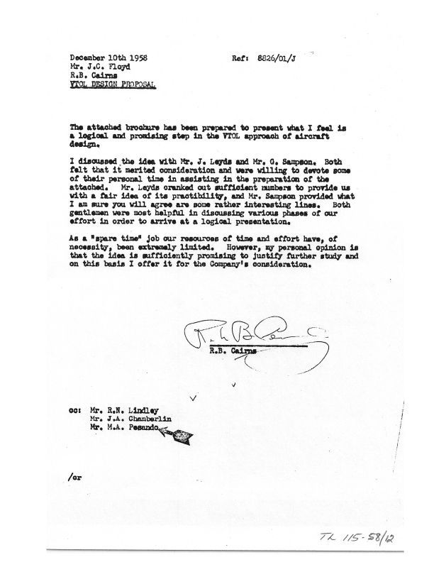 Descriptive narrative of a concept for a VTOL Ramjet Aircraft for further consideration by Avro Aircraft. Names include R.B. Cairns, James "Jim" Arthur Chamberlin, Robert N. (Bob) Lindley, M.A. Pesandro.