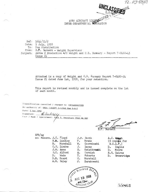 July 1, 1958 - 7-0400-34 Issue 21 - PS13 Engines, 4 Sparrow II Missles, Astra 1 Radar, Infra Red Tracker Installed. Report sent to J.C. Floyd, R.N. Lindley, R. Marshall, C.V. Lindow, J.W. Ames, B.C. Alford, D. Wade, D.N. Scard, A.R. Buley, J.P. Booth, F. Brame, W. Czerwinski, J. Lucas, S. Kwiatkowski, A. Cornish, C. Marshall, J. Zurakowski, A.J. Crust, D. Inglis, D. Moore, R.B. Cairns, D. Brownridge