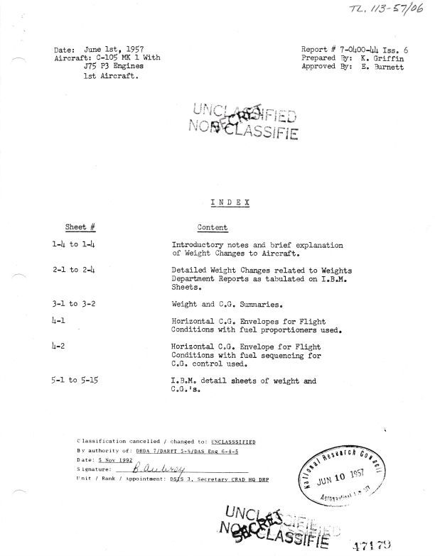 Weight and CofG Summary of the C-105 Mk1 First Aircraft w/J75 P3 Engines; Report #7-0400-44, Issue 6Entry/Object ID