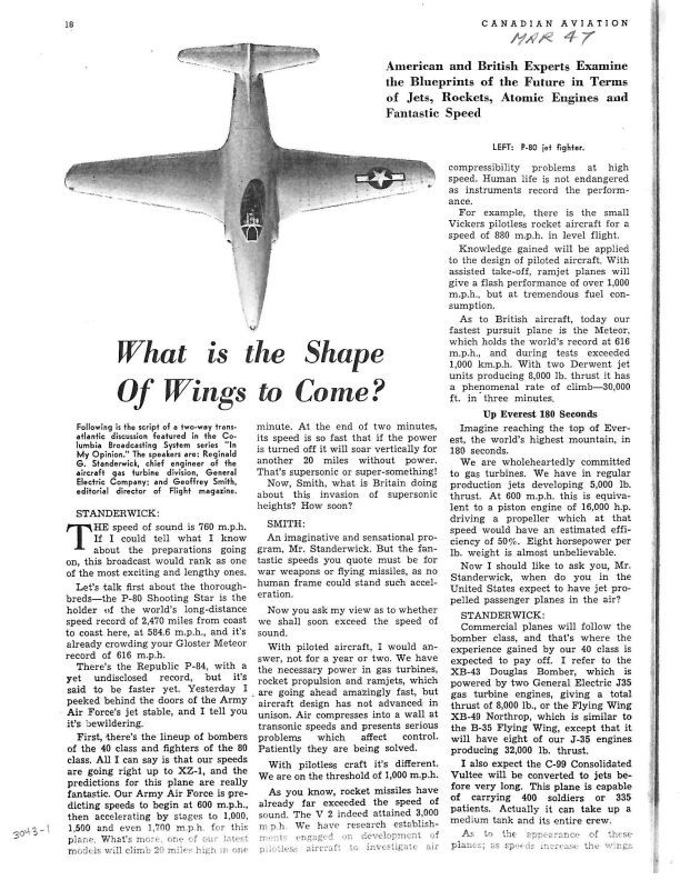 pg 18,19,60 American and British Experts Examine the Blueprints of the Future in Terms of Jets, Rockets, Atomic Engines and Fantastic Speed. The story discusses speed, reliability and technology of the newest aircraft and engines. Turbine engine power of 10,000 lb thrust in development.General Notes