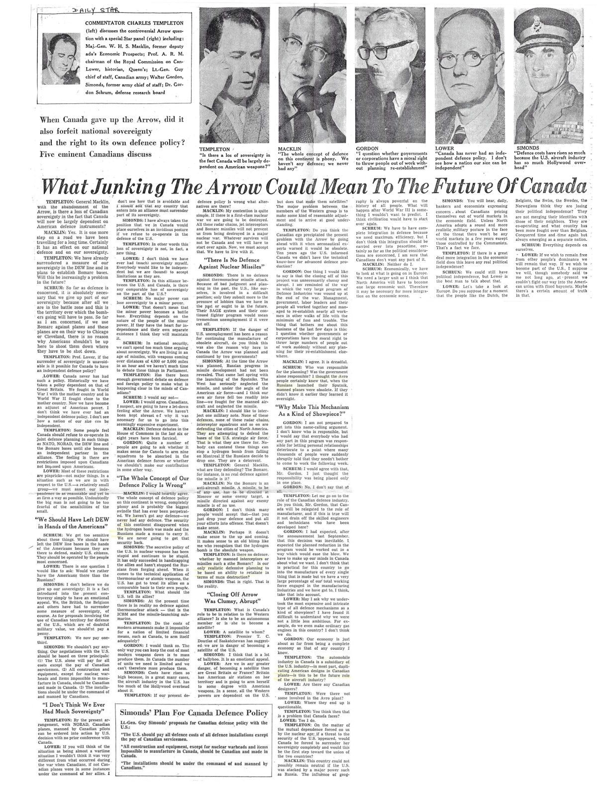 Panel consisting of commentator Charles Templeton, Generals Macklin and Simonds, Professor Lower (historian), Dr. Schrum (Defense Research Board) and Walter Gordon discuss Arrow and Canadian sovereigntyPublication Details