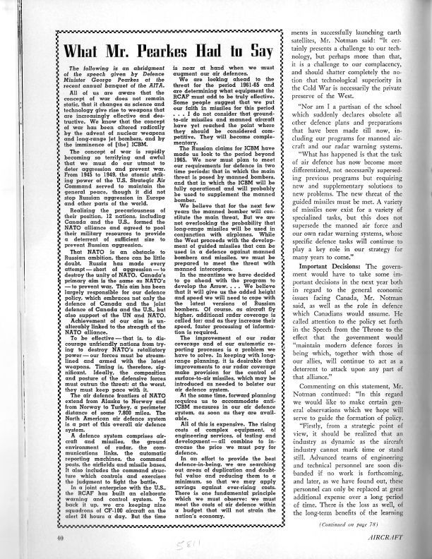 pg 40 The text (abridged) of the speech by Defence Minister Pearkes at the IATA 1957 annual meeting. He outlined the government's air defence strategy in view of the ICBM threat and gave the government's reasons for going ahead with the Arrow project. He also mentioned the ongoing reliance on the nine squdrons of CF-100's.Publication Details