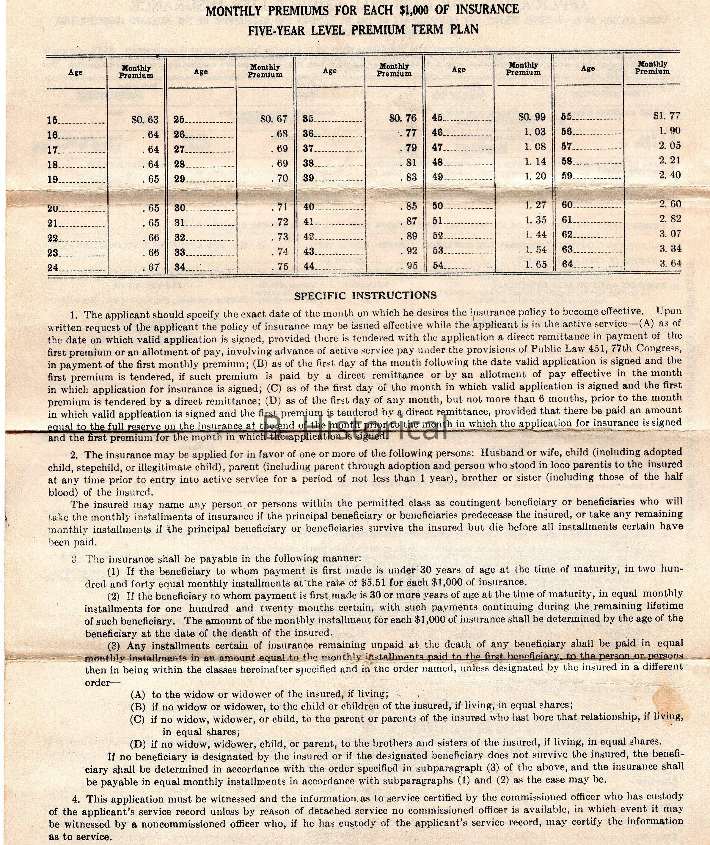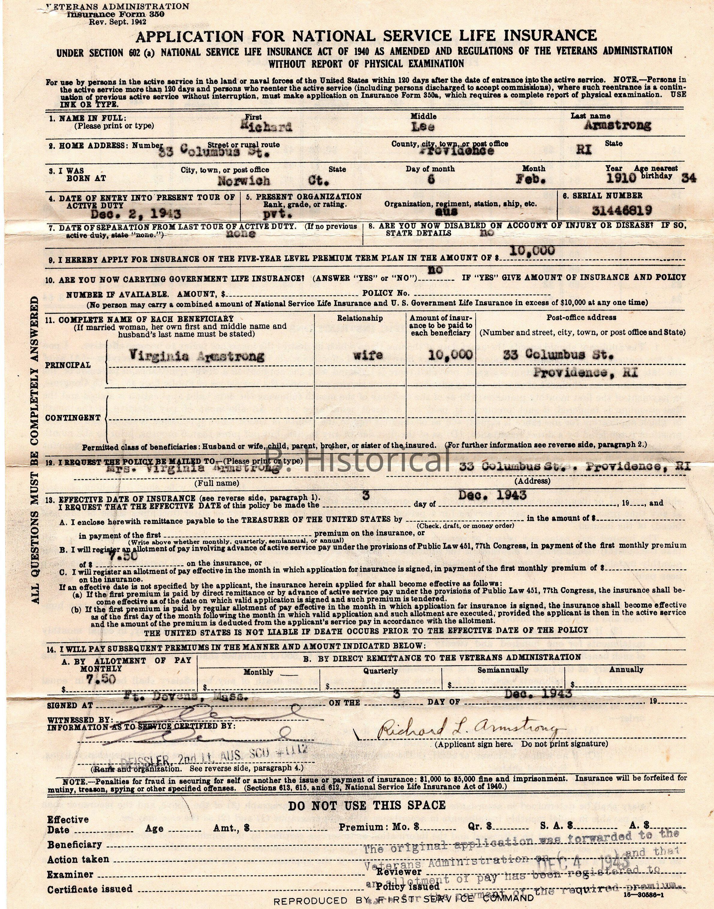 An application for National Life Insurance from 1943 when a soldier enlisted in the army.Created By