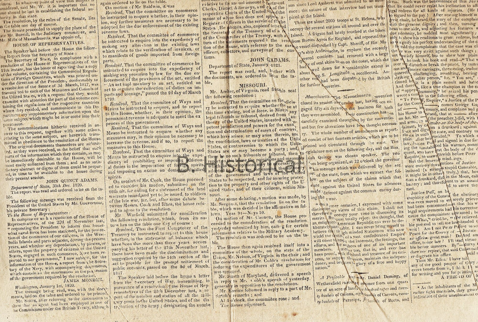 The newspaper includes early notes on the forming of the U.S. constitution, including writings by John Quincy Adams, John Adams and James Monroe. Newspaper is fragile, so only parts could be scanned in.Created By