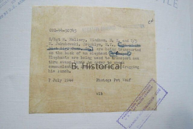 A photograph of an elephant (dragging a large stick, as if it is a dog) carrying men to check communication lines through a swamp in 1944.Created By
