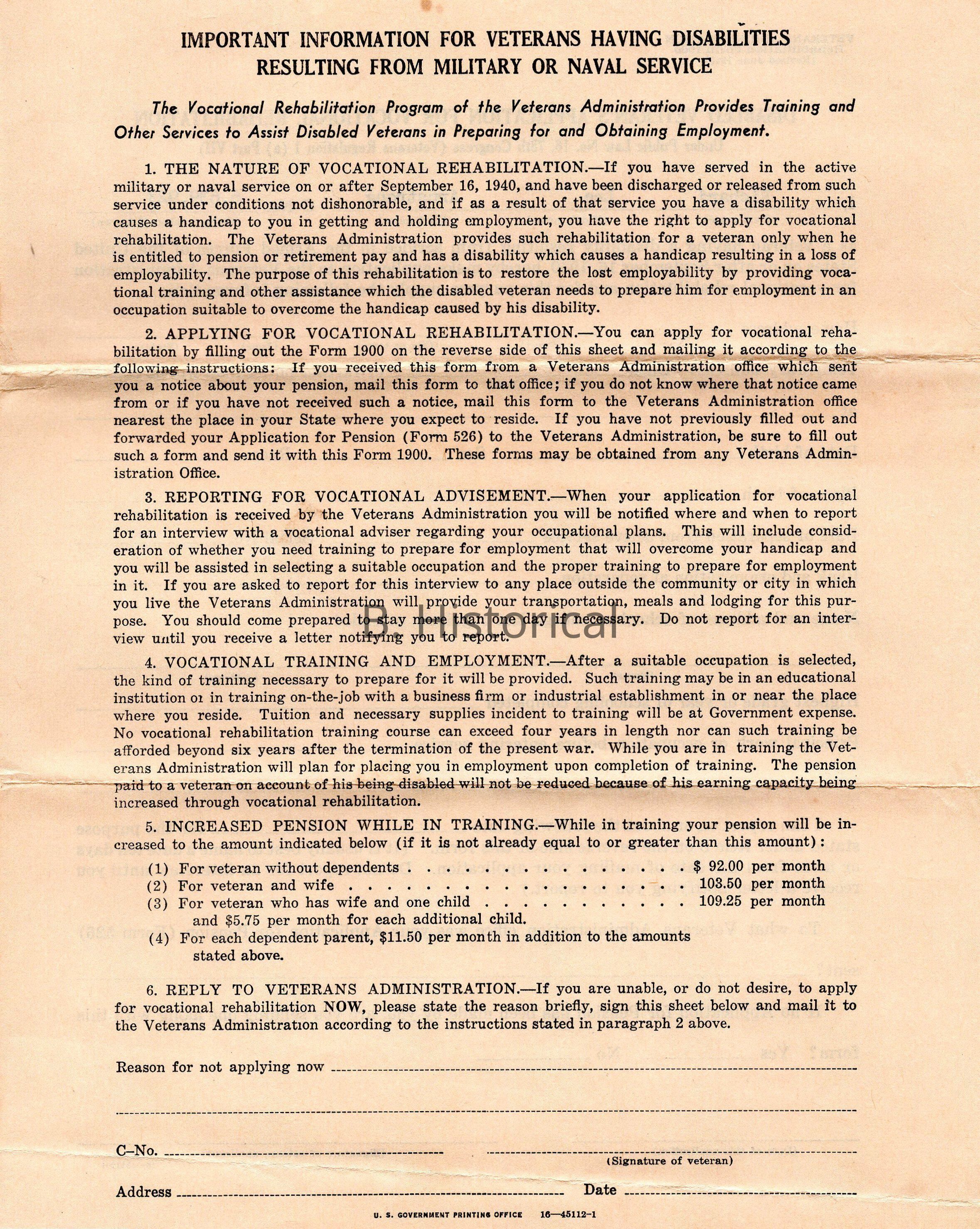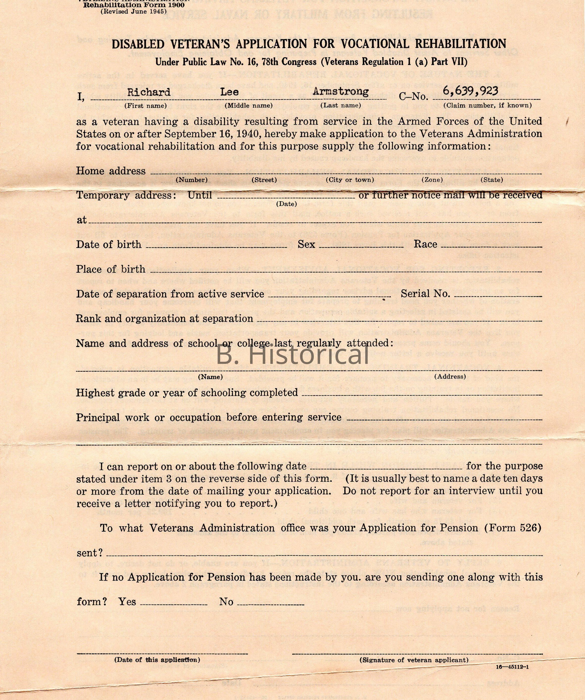 Form 1900 Disabled Veteran's Application, WWIIEntry/Object ID