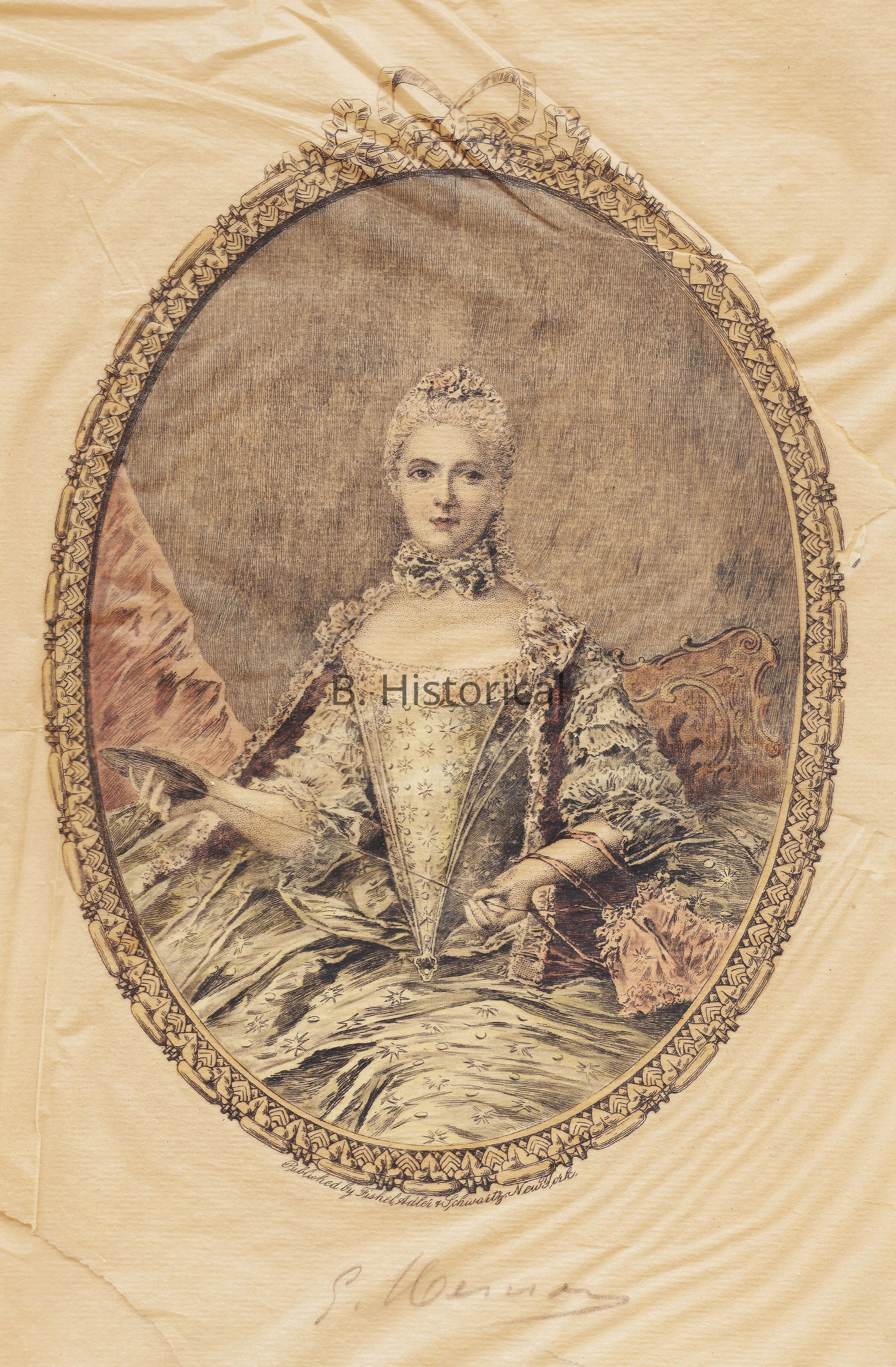 This engraving was made on vellum, making it very delicate. It is already damaged and was acquisitioned that way. Based on the art form used, it is from the 19th C, however of an 18th century woman.Created By