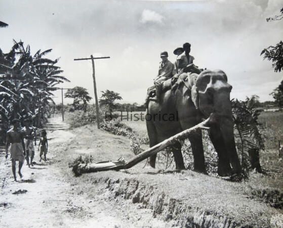 A photograph of an elephant (dragging a large stick, as if it is a dog) carrying men to check communication lines through a swamp in 1944.Created By