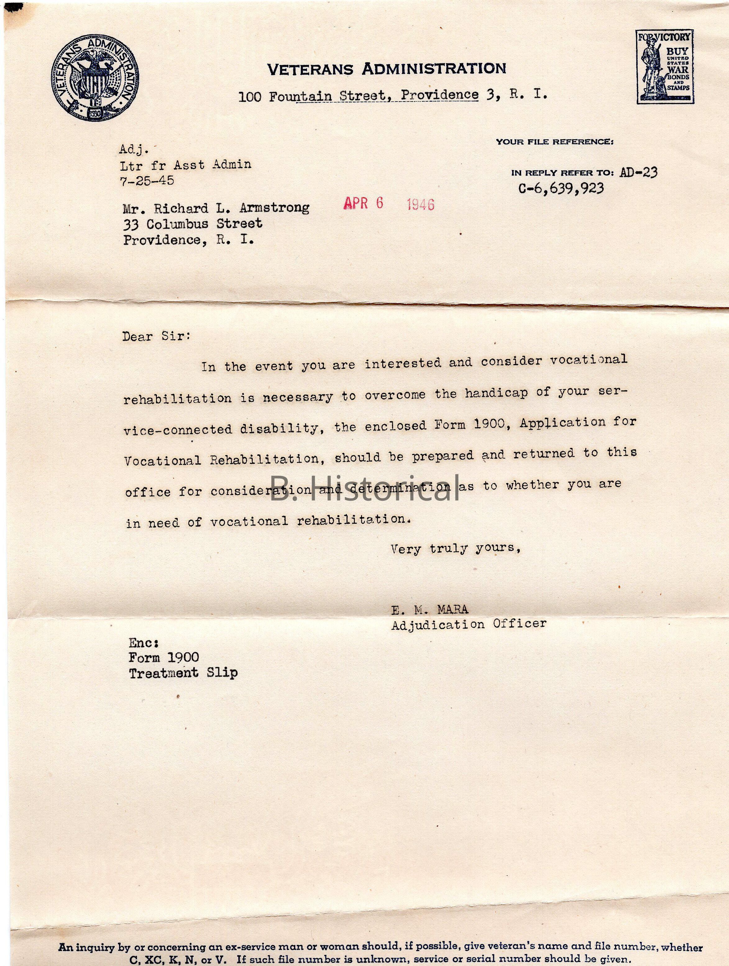 This letter, sent on 7/25/1945 was sent to a hurt soldier looking to see if he needed vocational rehabilitation.Created By