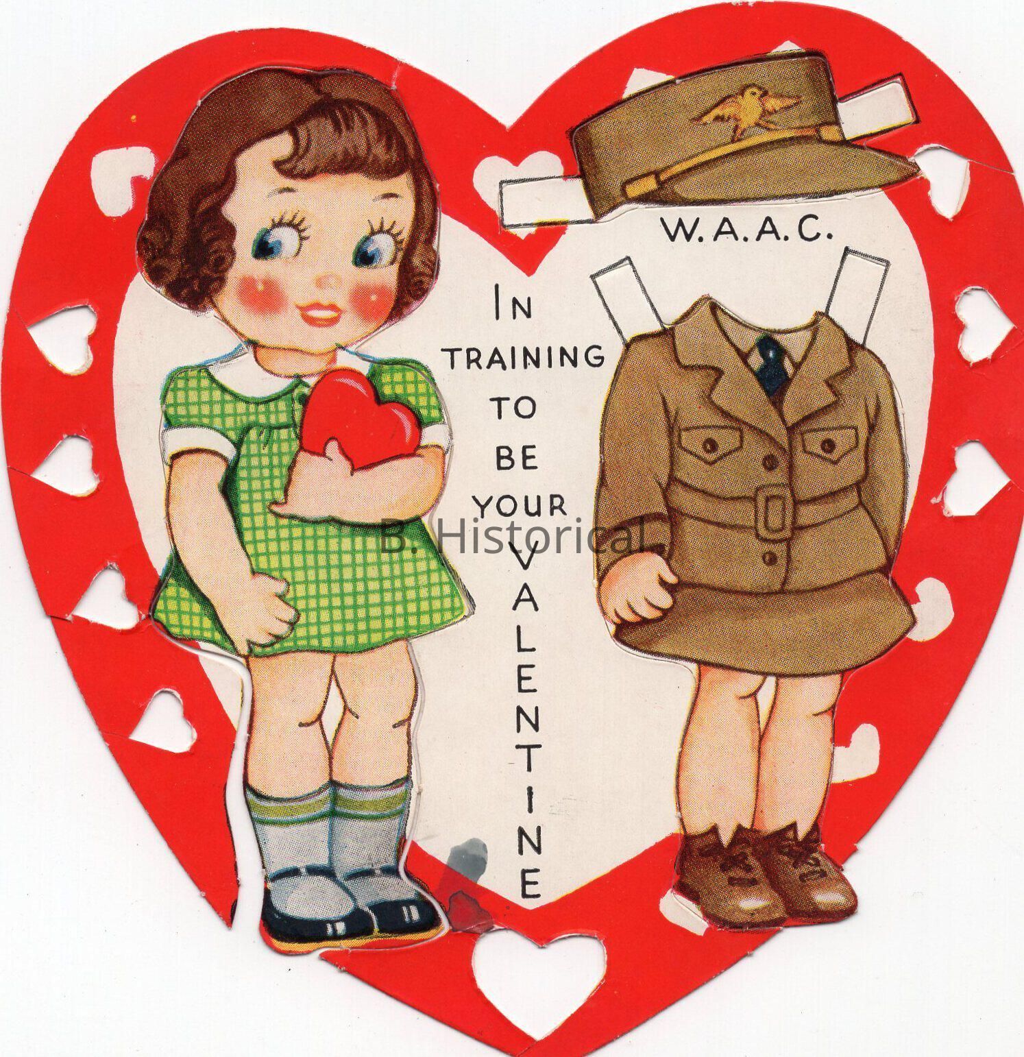 A WAAC Valentine with a push out paper doll. Someone cut out some of the hearts on the card.Created By