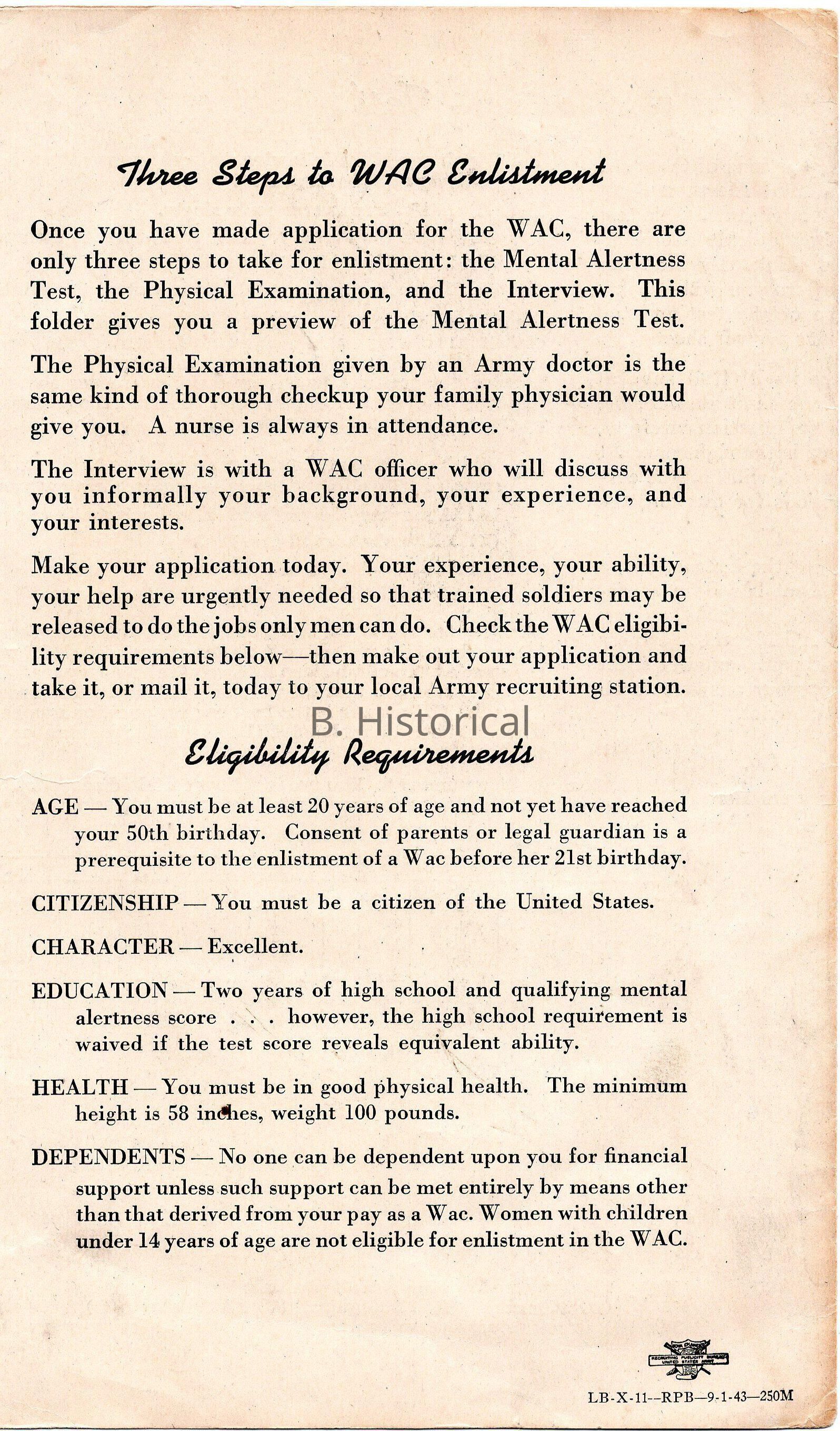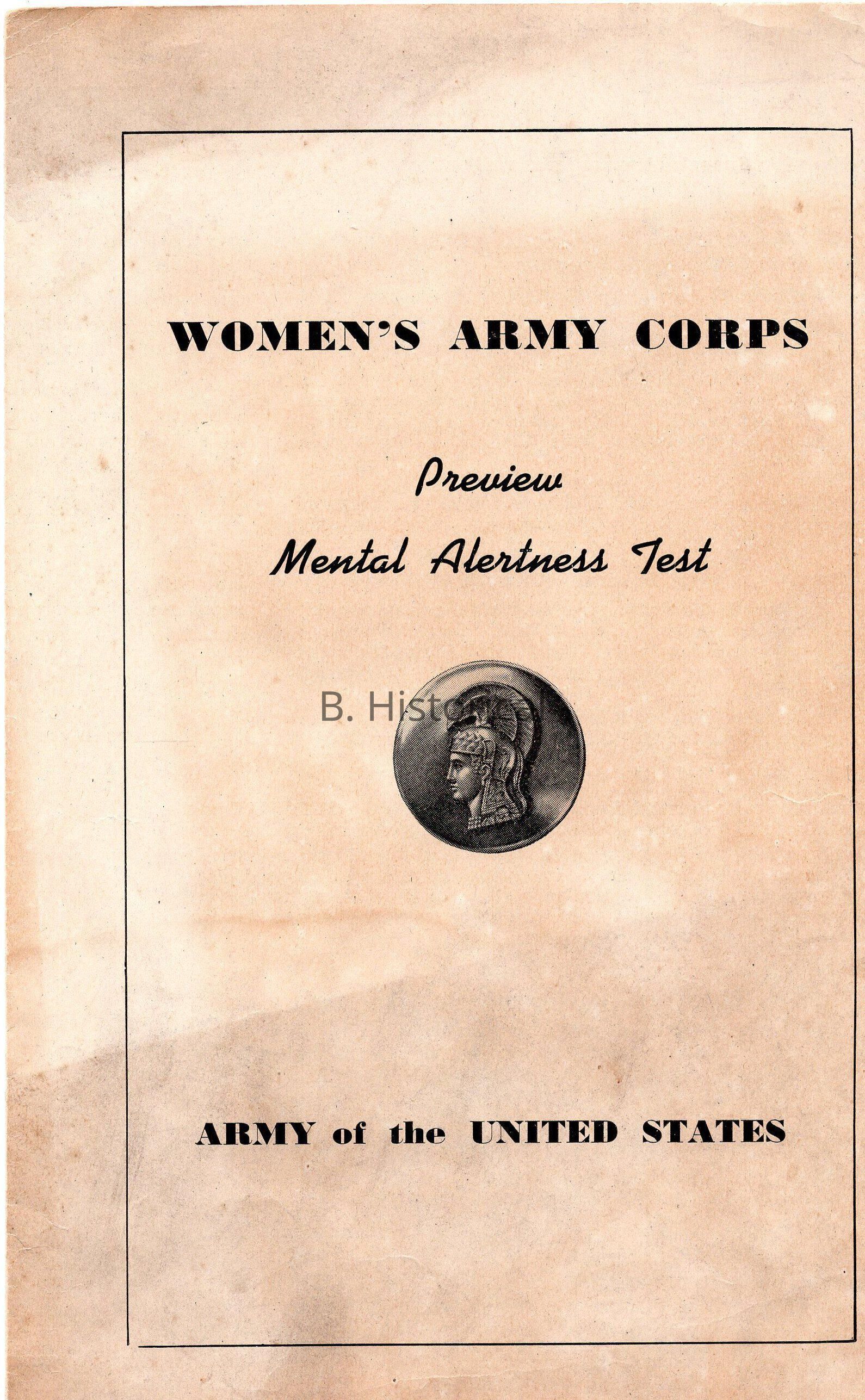 There were 3 steps to joining the WAC, the Women's Army Corps. The first was a mental alertness test, than a physical, and lastly and interview. This was a booklet handed out to those enlisting to see what the test would entail. Published in September of 1943.Created By