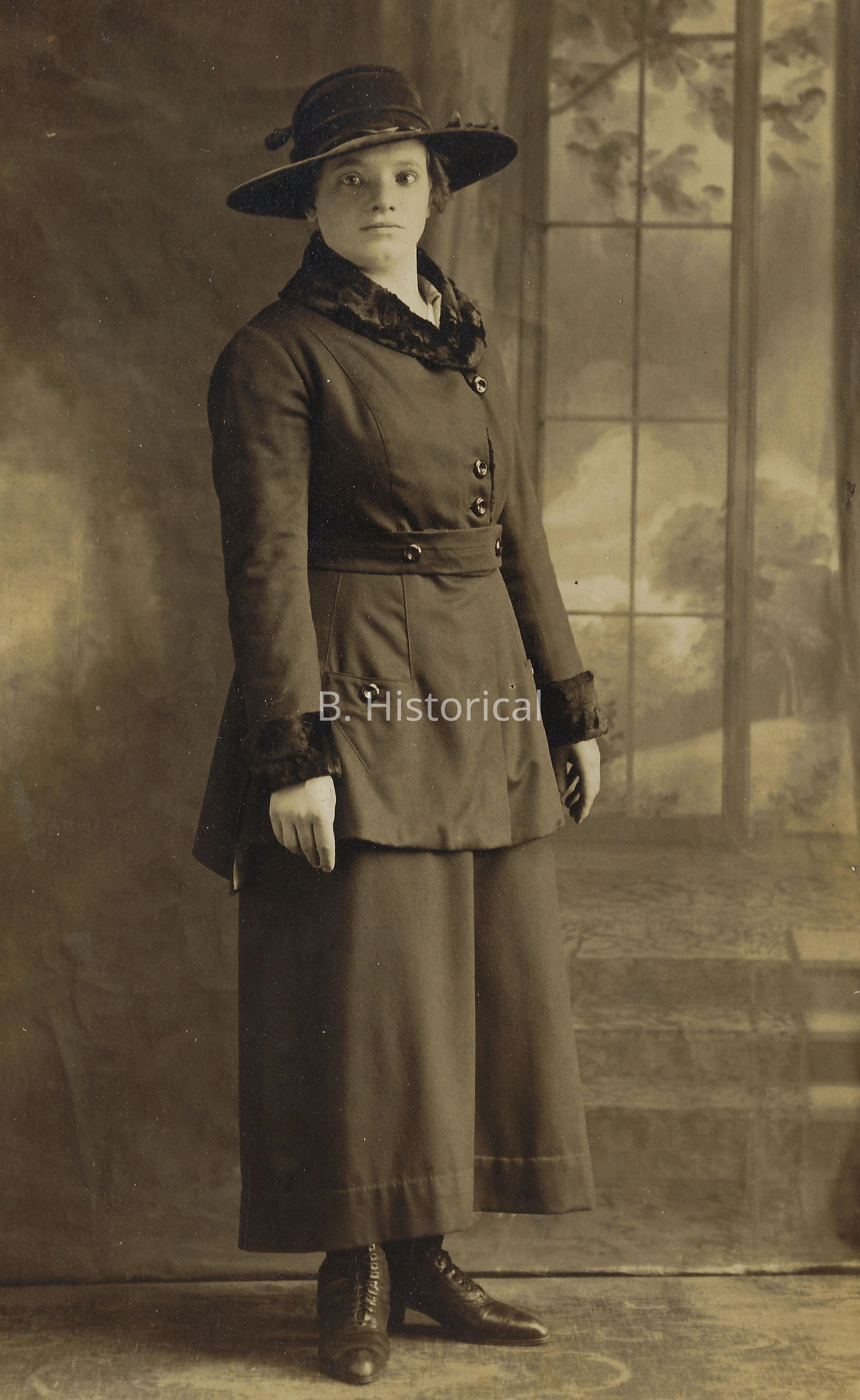 3.25" x 5.25" Photograph/Postcard of a woman in early 20th century styled clothing. Notice the wide hem on the pants/skirt and the fabric that doesn't seem to hang properly on the jacket. Cuffs and collar are fur.Created By