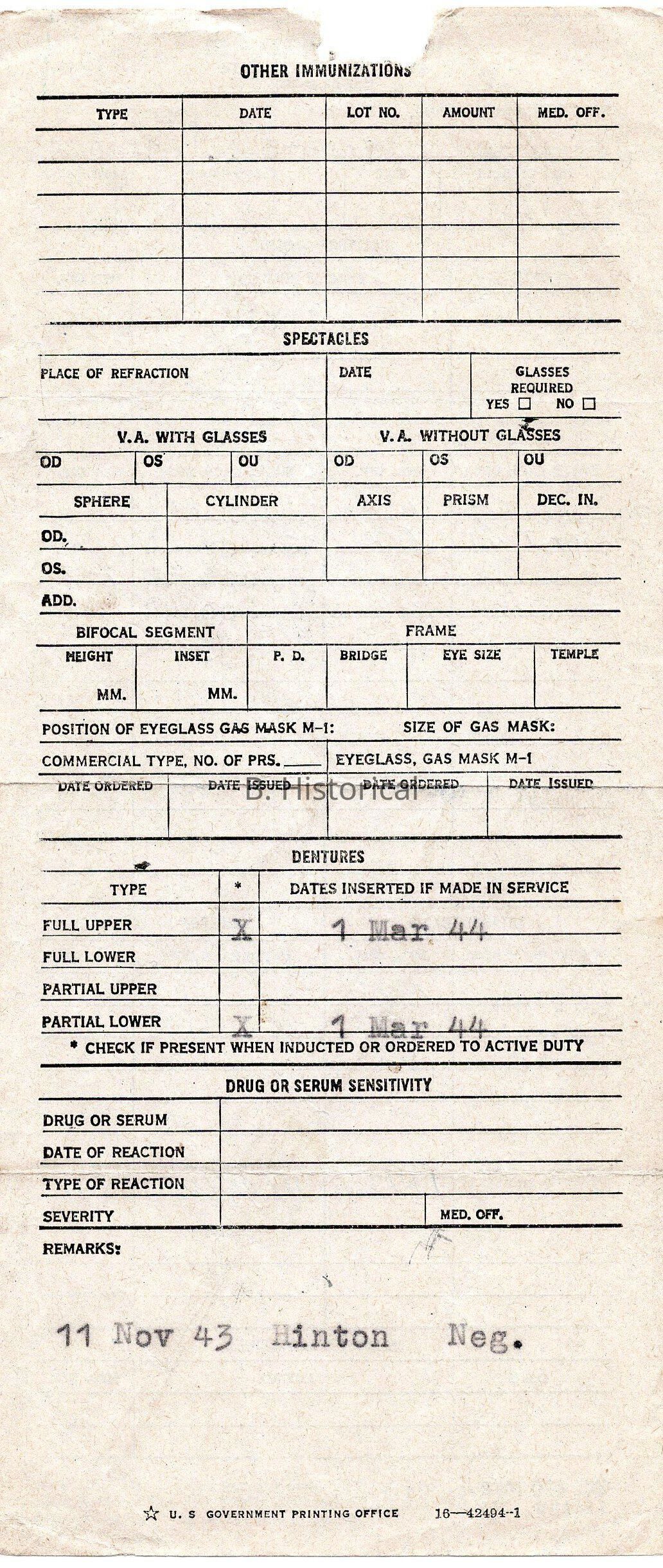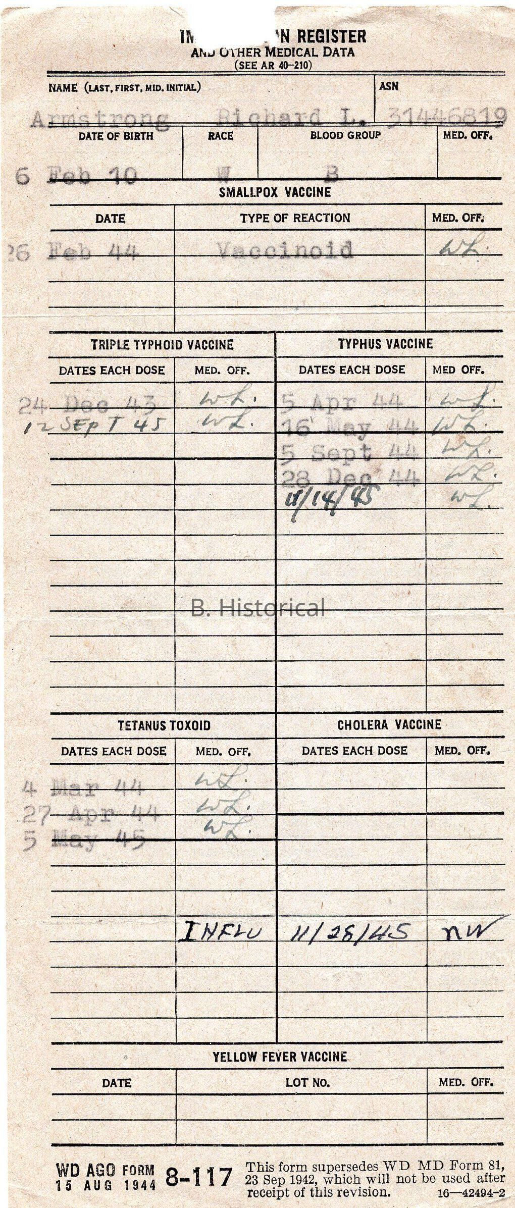 Immunization record for a WWII Soldier starting in 1943, when enlisted until discharge in 1945Created By