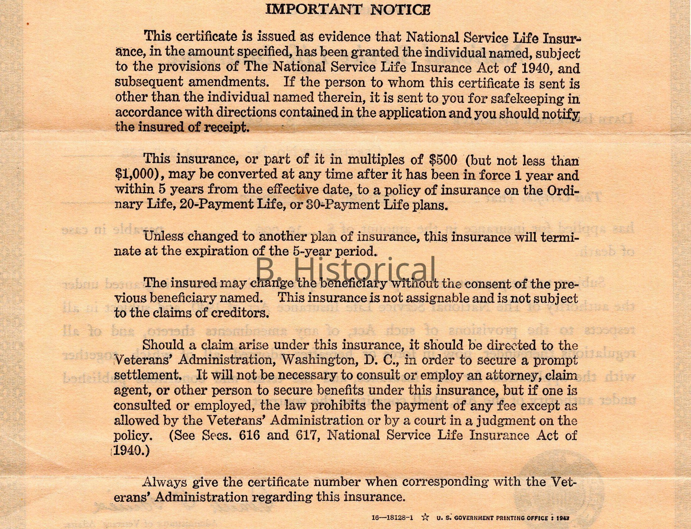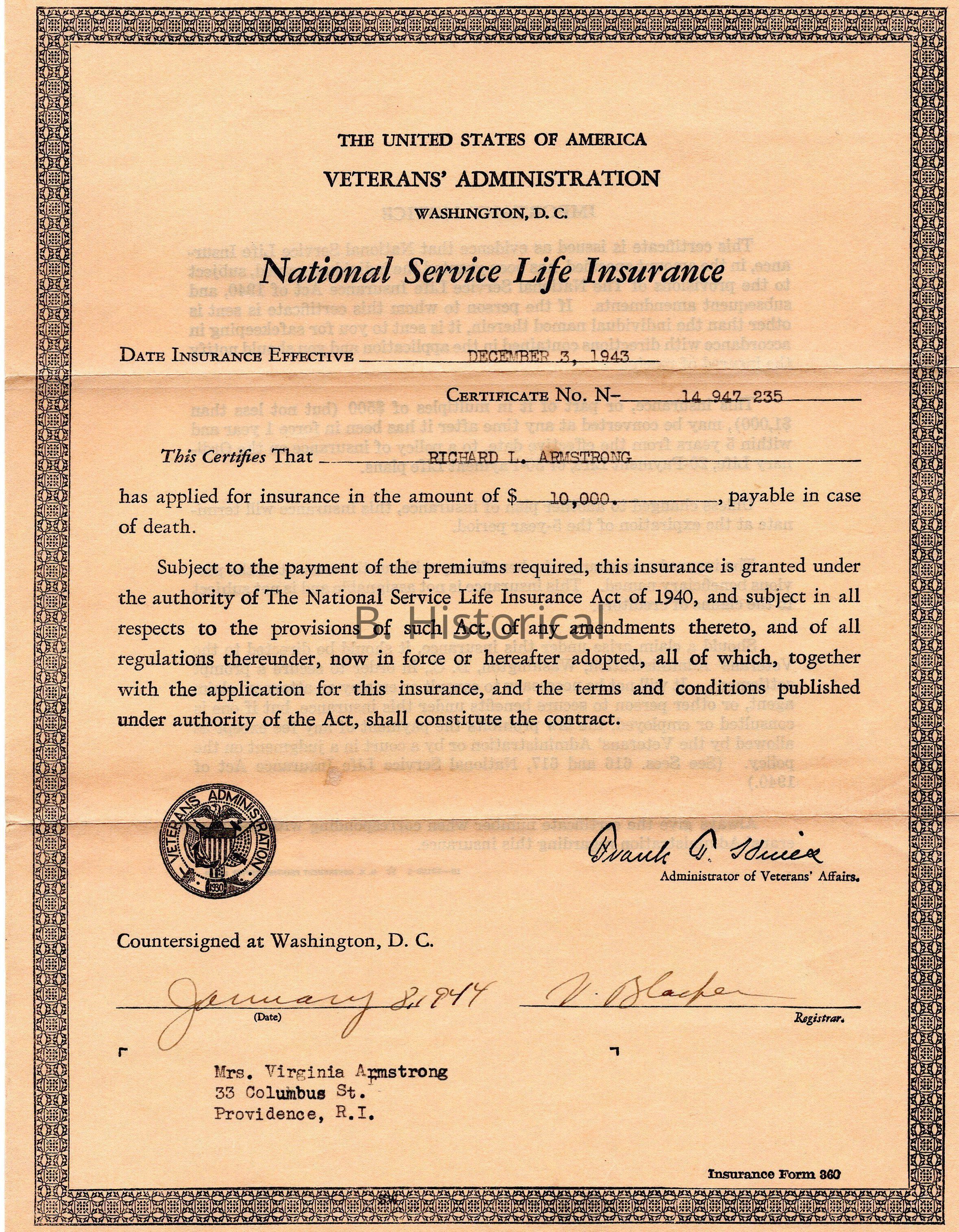 Insurance certificate in case the soldier is killed in service. Covers $10,000 in case of death.Created By