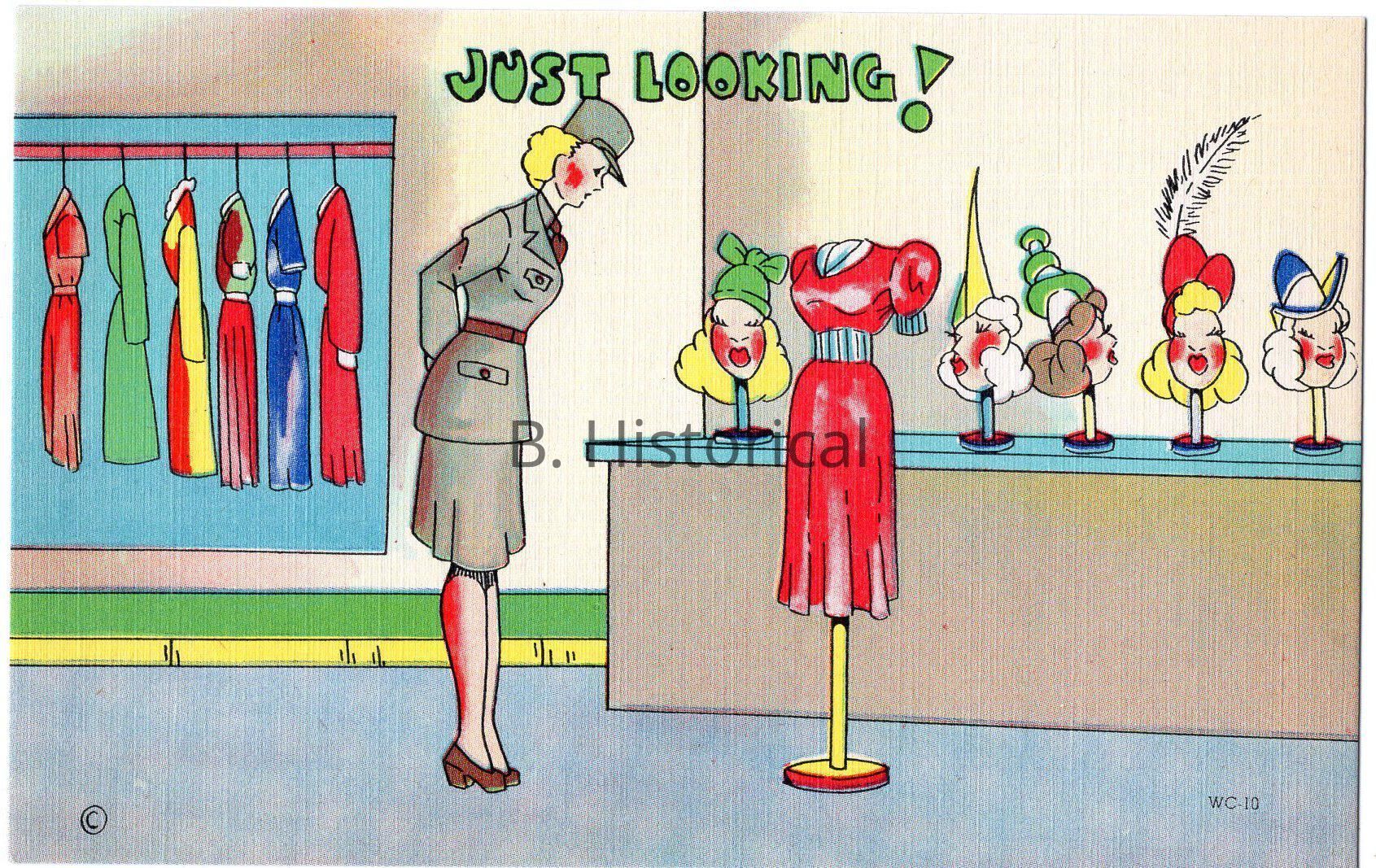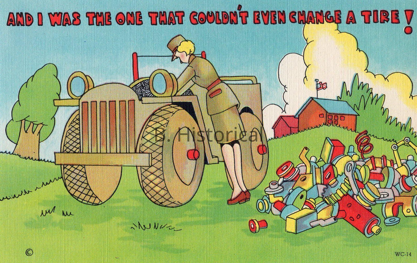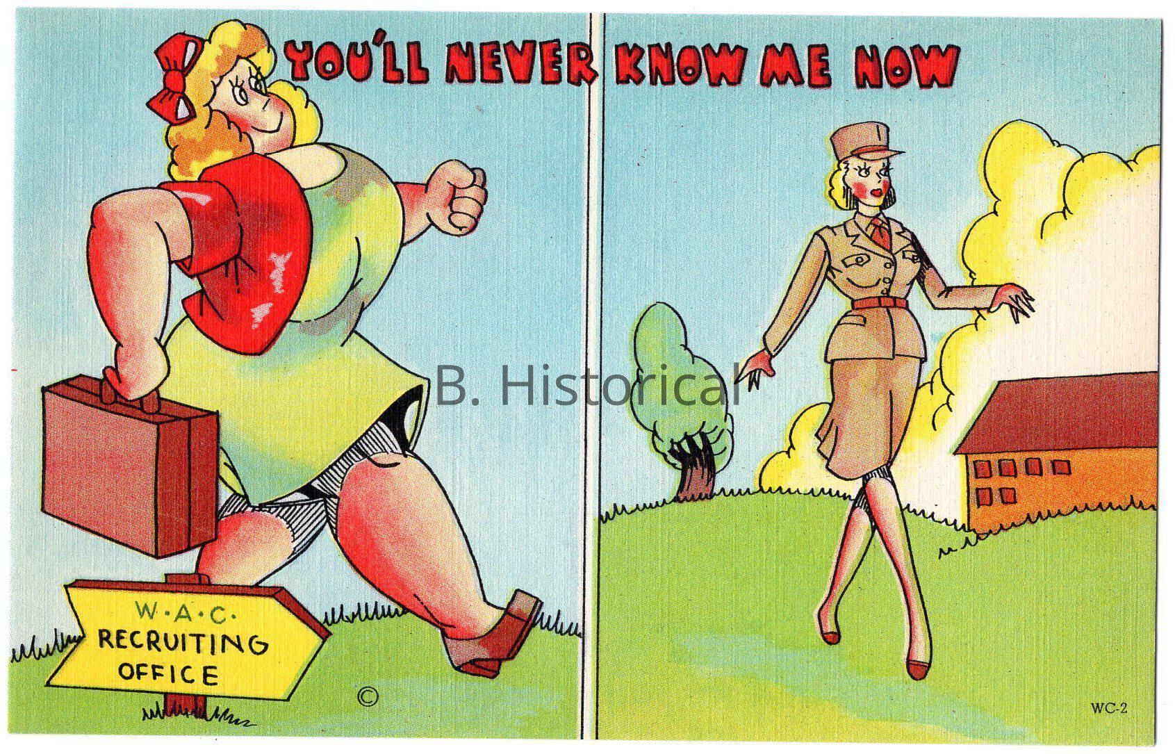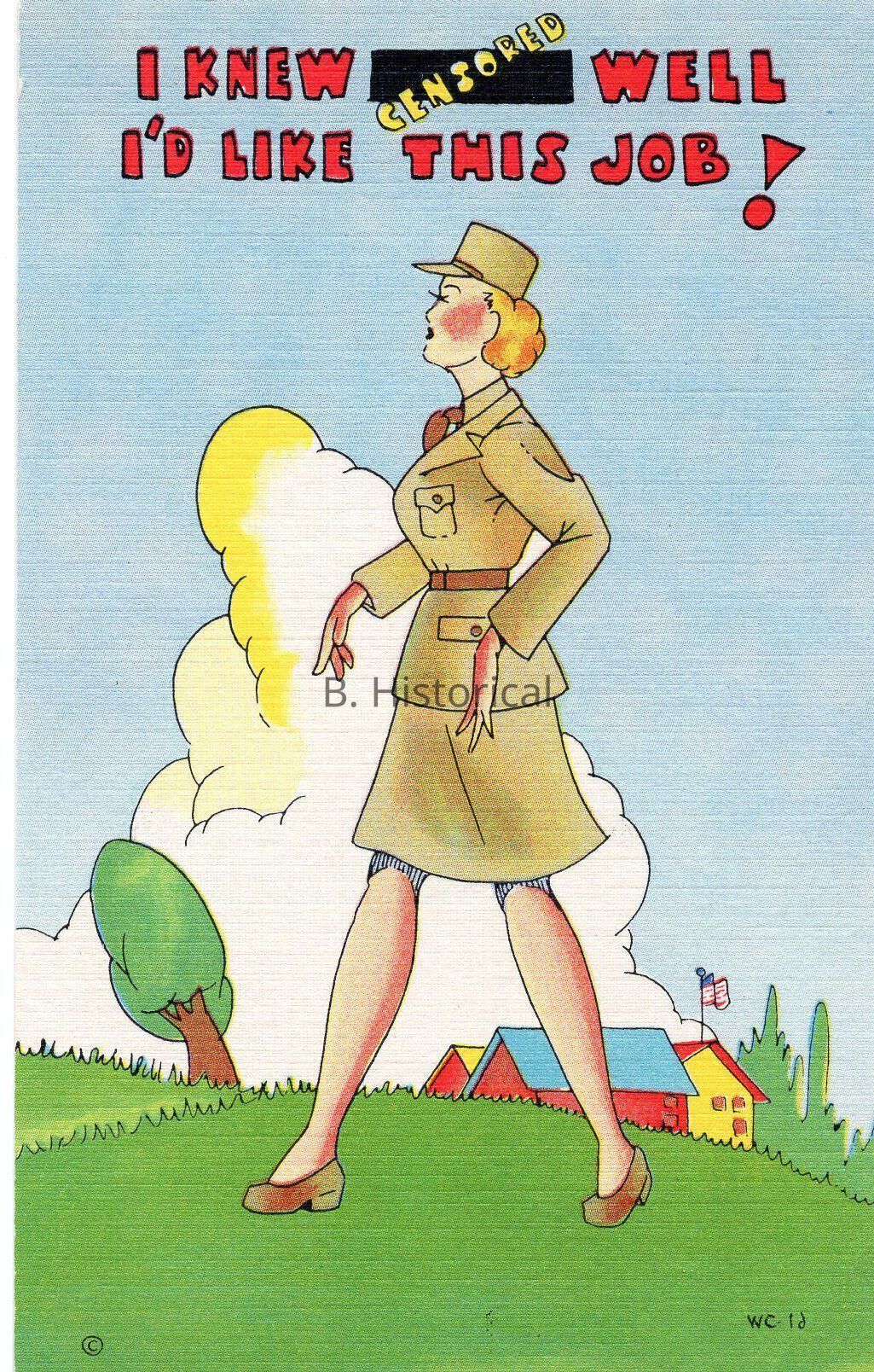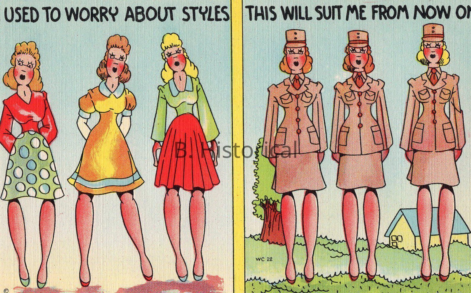 Printed on a textured linen paper, this post card displays women finally getting to serve their country officially in WWII. The women pictured are enlisted in the Women's Army Auxiliary Corps, or WAAC in an early summer khaki uniform.Created By