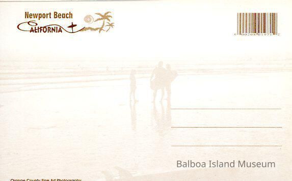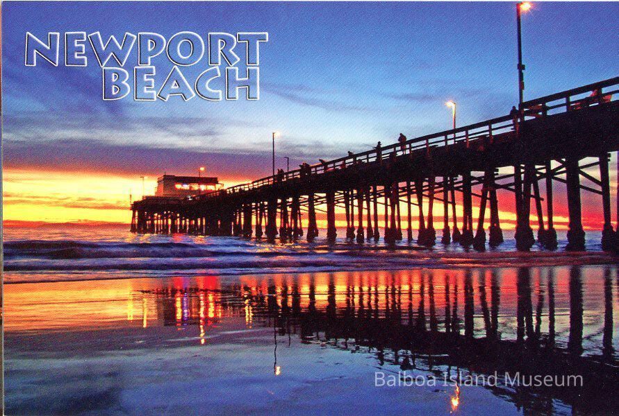 A color photograph postcard of the Balboa pier at late sunset with a yellow horizon. Taken from the left beach. "Newpo0rt Beach" is written in the upper left corner in translucent bubble letters.