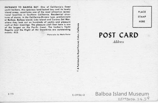 Published by Royal Pictures in Colton, California. There is a paragraph on the back about Balboa Bay written by Merle Porter. Postcard number B-173. Printer number S-2936-2.Subject