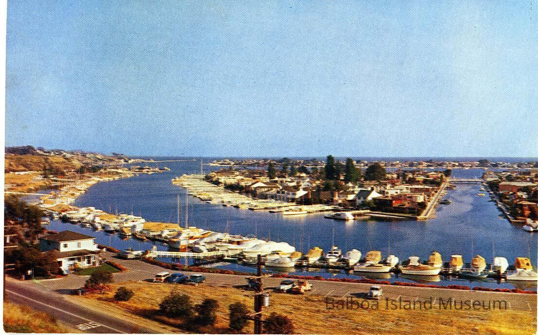 A color postcard of Little Island and Grand Canal with the yacht storage facility across the Balboa bay in the foreground. There are a few cars in the parking lot of the yacht storage facility.