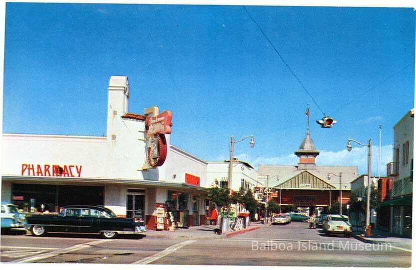 A color photograph of the Balboa Pavilion taken from the intersection of Main street and Balboa blvd. The pharmacy is on the left with the full sign clearly visible and no cars in the intersection.