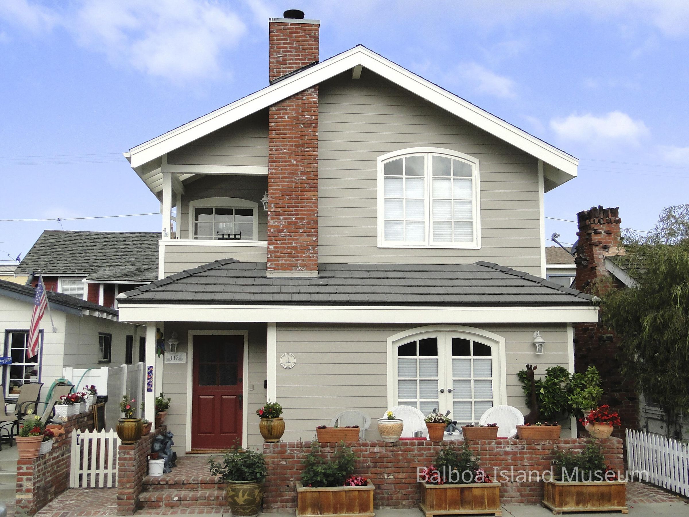 Color photo in front of home at 117 Marine Avenue. It was built in 1992. The buildings is two stories with a chimney in the front, domed windows on the top floor, french doors on the bottom, a red front door, and grey horizontal slat boards across the front. The building is elevated above street level and sits on a brick patio with brick stairs and a low brick wall around the patio.Photograph Details