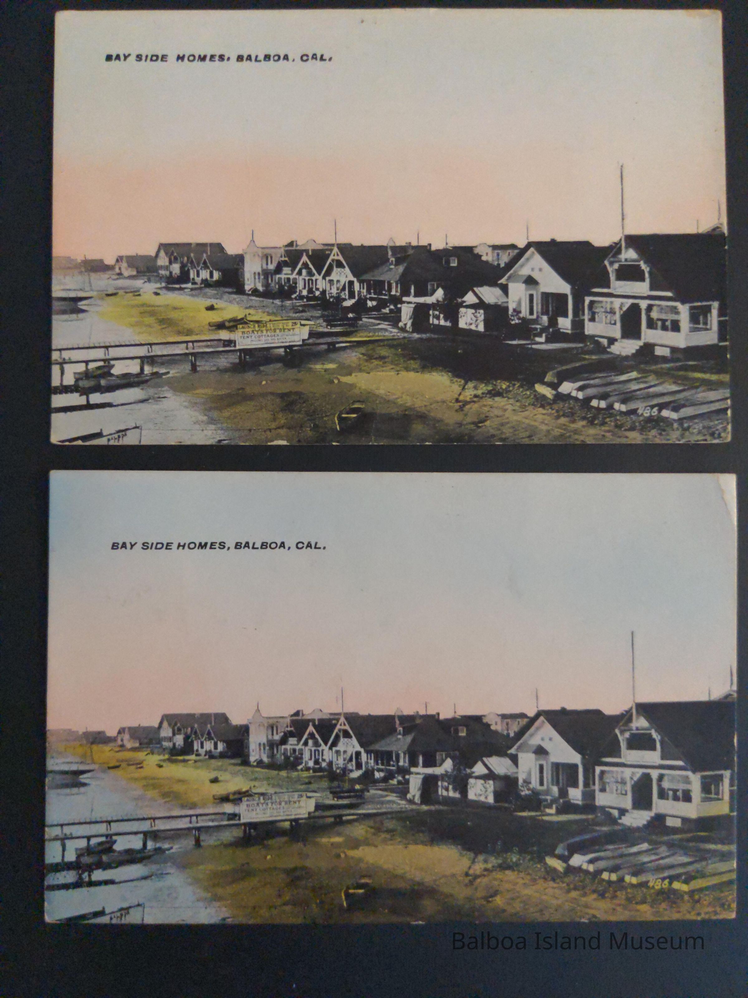 Two colorized photograph postcards of the buildings to the right of the Balboa Pavilion taken from the Pavilion or the Pavilion docks.