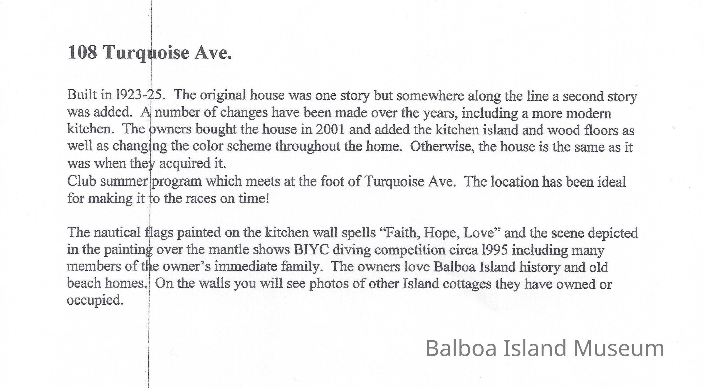 Leaflet concerned with the history of 108 Turquoise Avenue. Discusses any known architectural changes made to the house since its construction.Lexicon