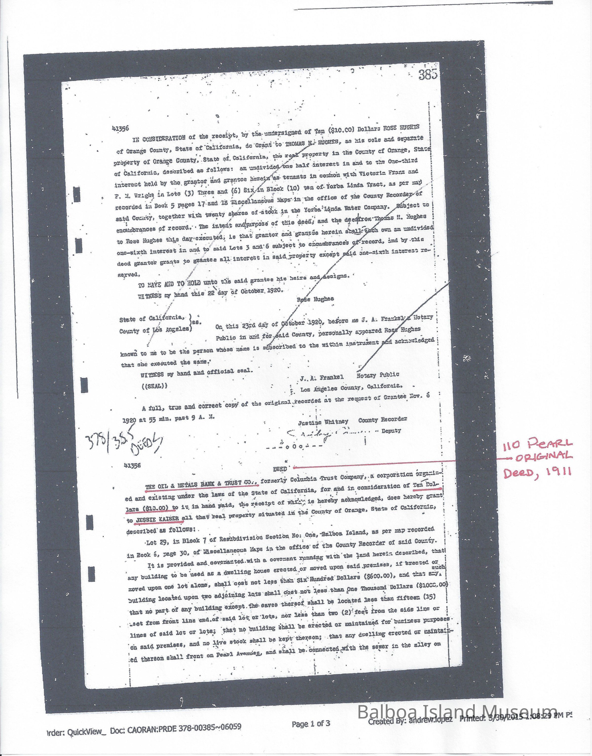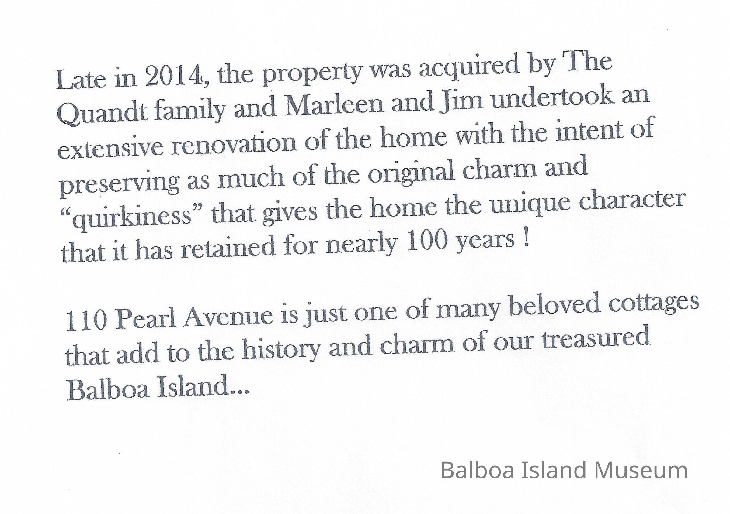 A leaflet is concerned with the history of 110 Pearl Avenue. Gives background information on the former homeowners and discusses any known architectural changes made to the house since its construction. Includes photos of the home's original deed as well as pictures of its renovation in 2014.Lexicon