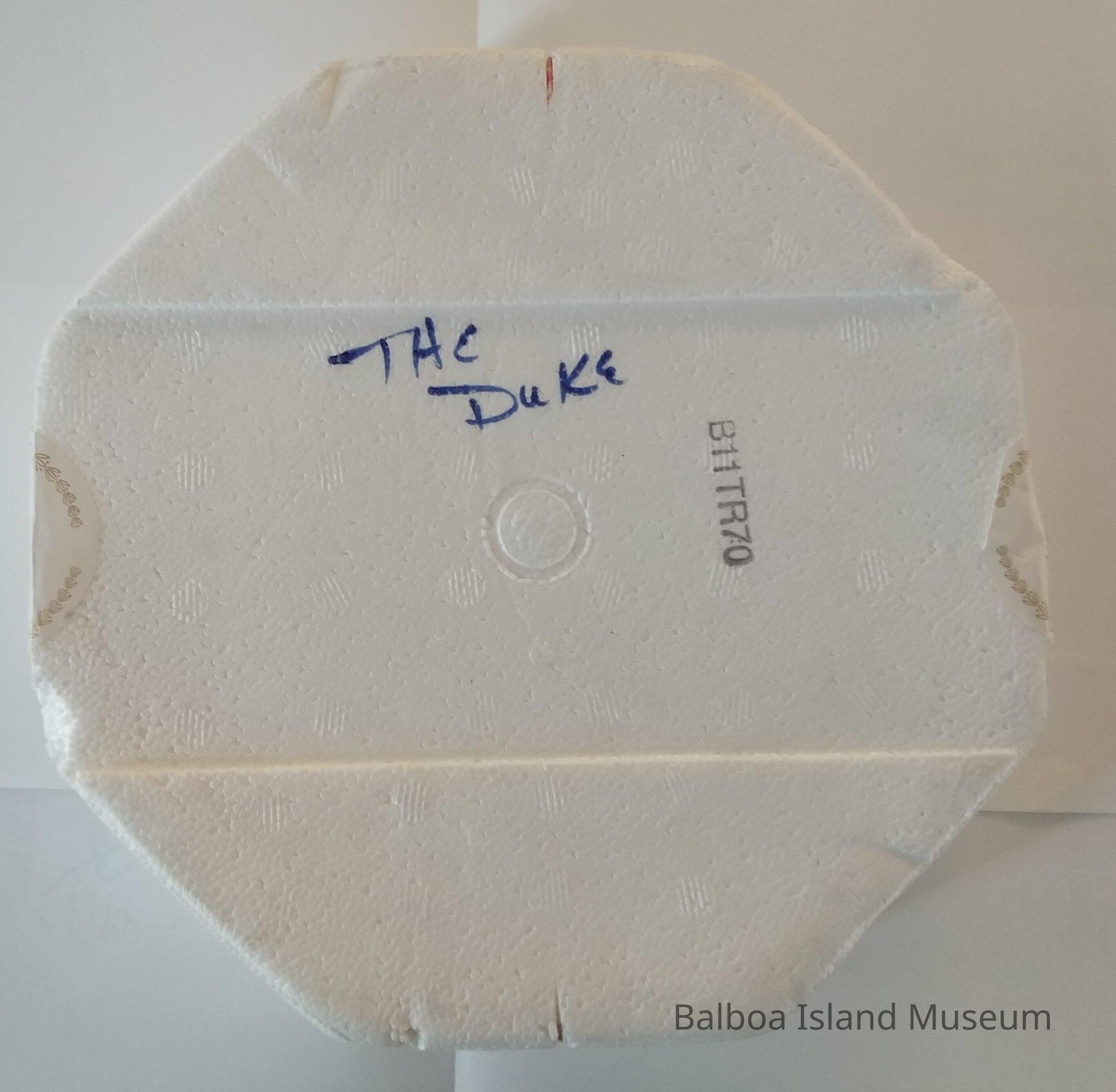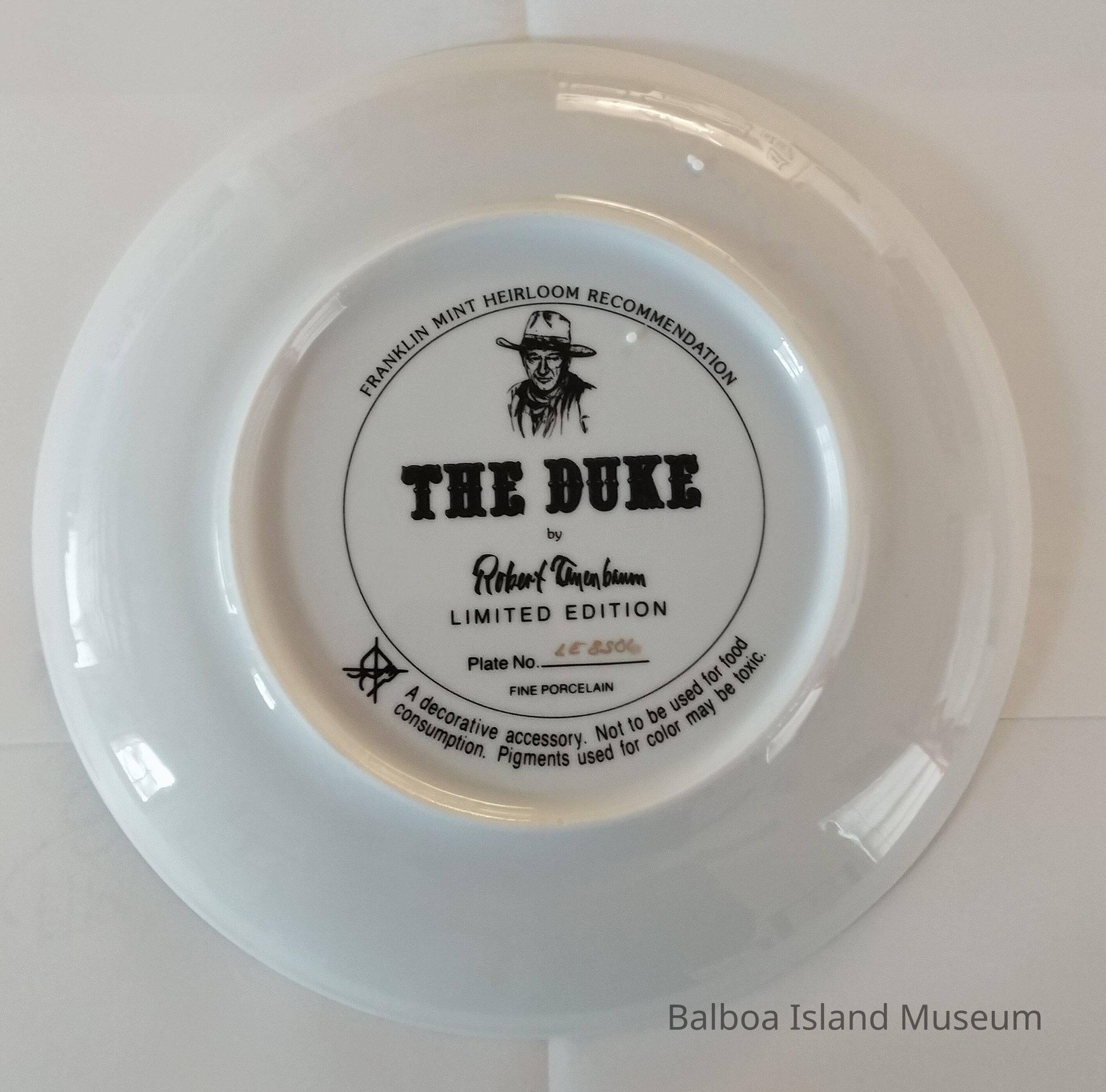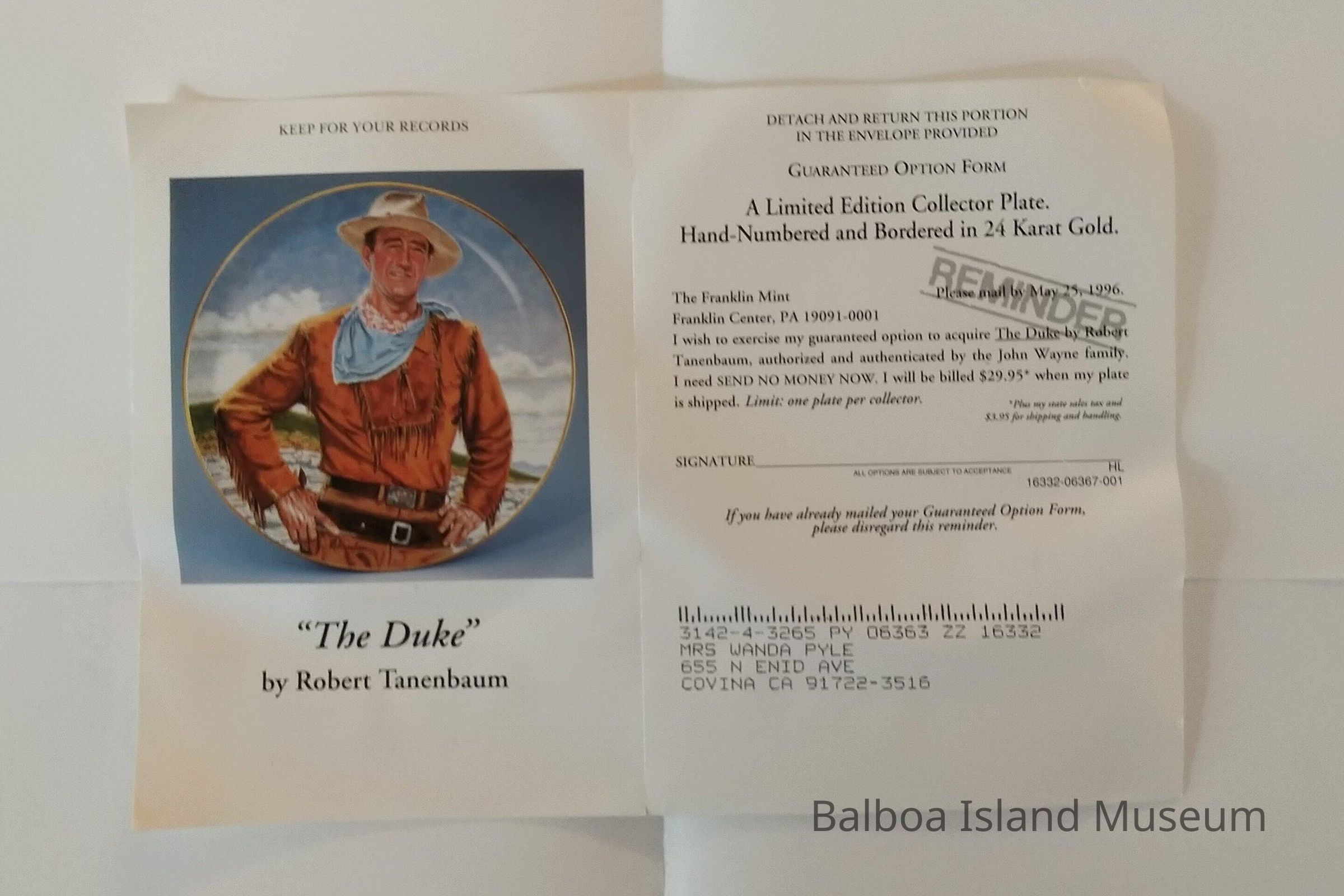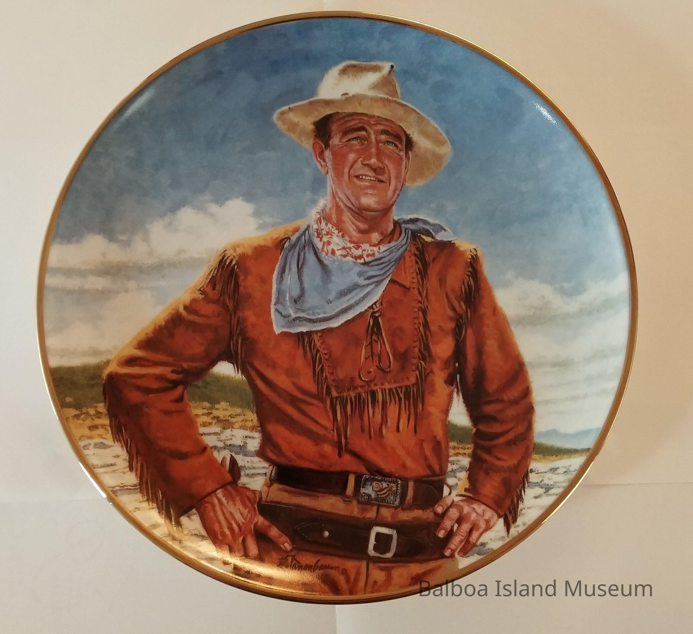 A commemorative plate feauting John Wayne dressed as a cowboy in what appears to be Arizona. He's dressed in a fringed letehr shirt and standart pants with a cream cowboy hat and blue bandana. The plate is edged in a simple gold ring. The plate was designed by Robert Tanenbaum and it is made of porcelain. The plate number o LE8506. It cmae in a styrofoam box and includes an order form for ordering the plates with the statement "please mail by May 25, 1996". The box is numbered B11TR70.