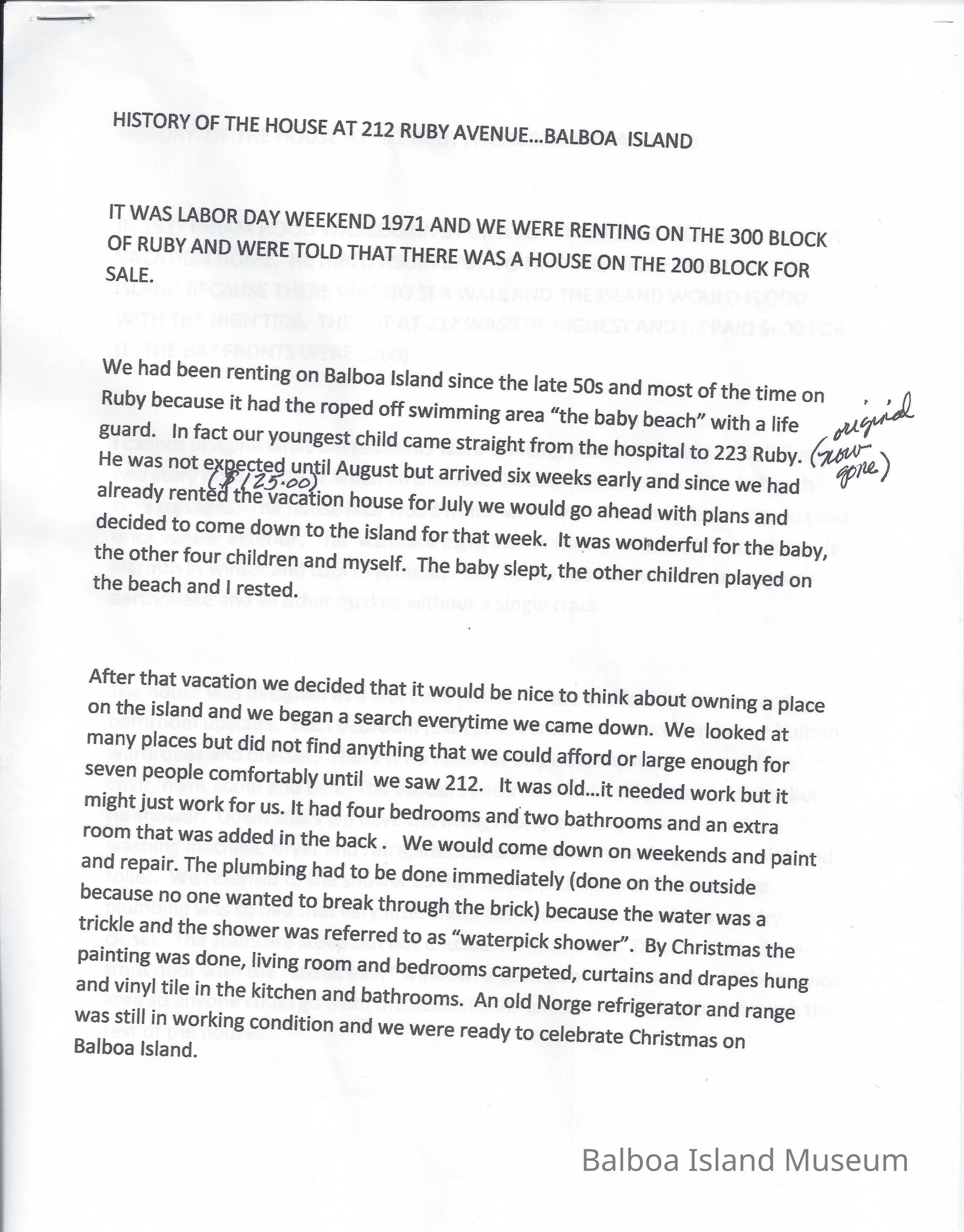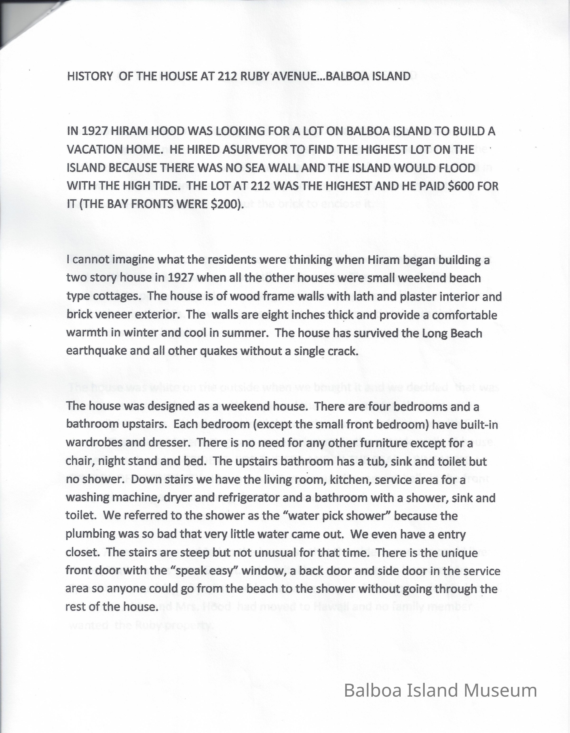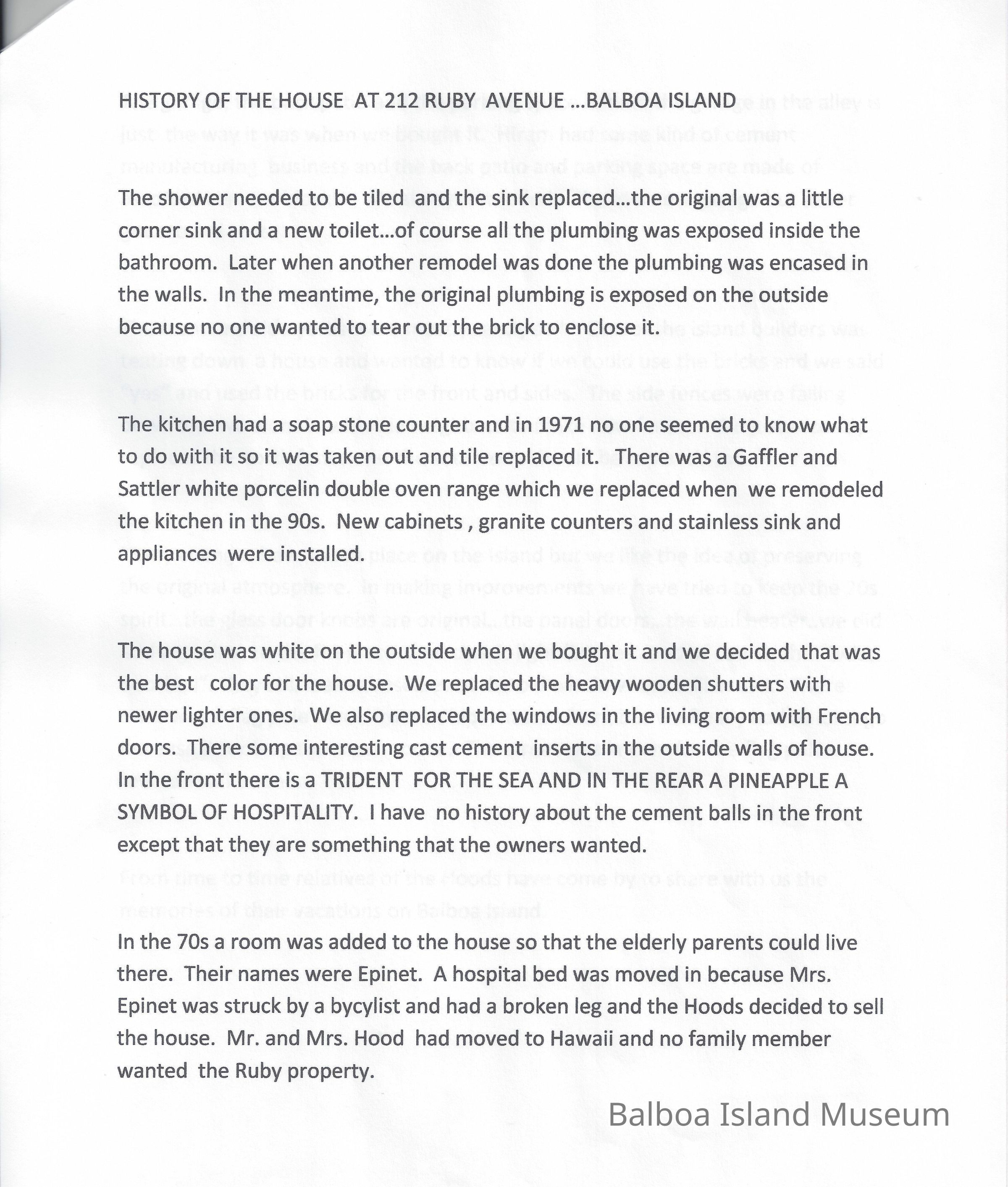 Leaflet concerned with the history of 212 Ruby Avenue. Gives backround information on the former homeowners and discusses known architectural changes made to the house since its construction. Narrated by the current homeowner.Lexicon