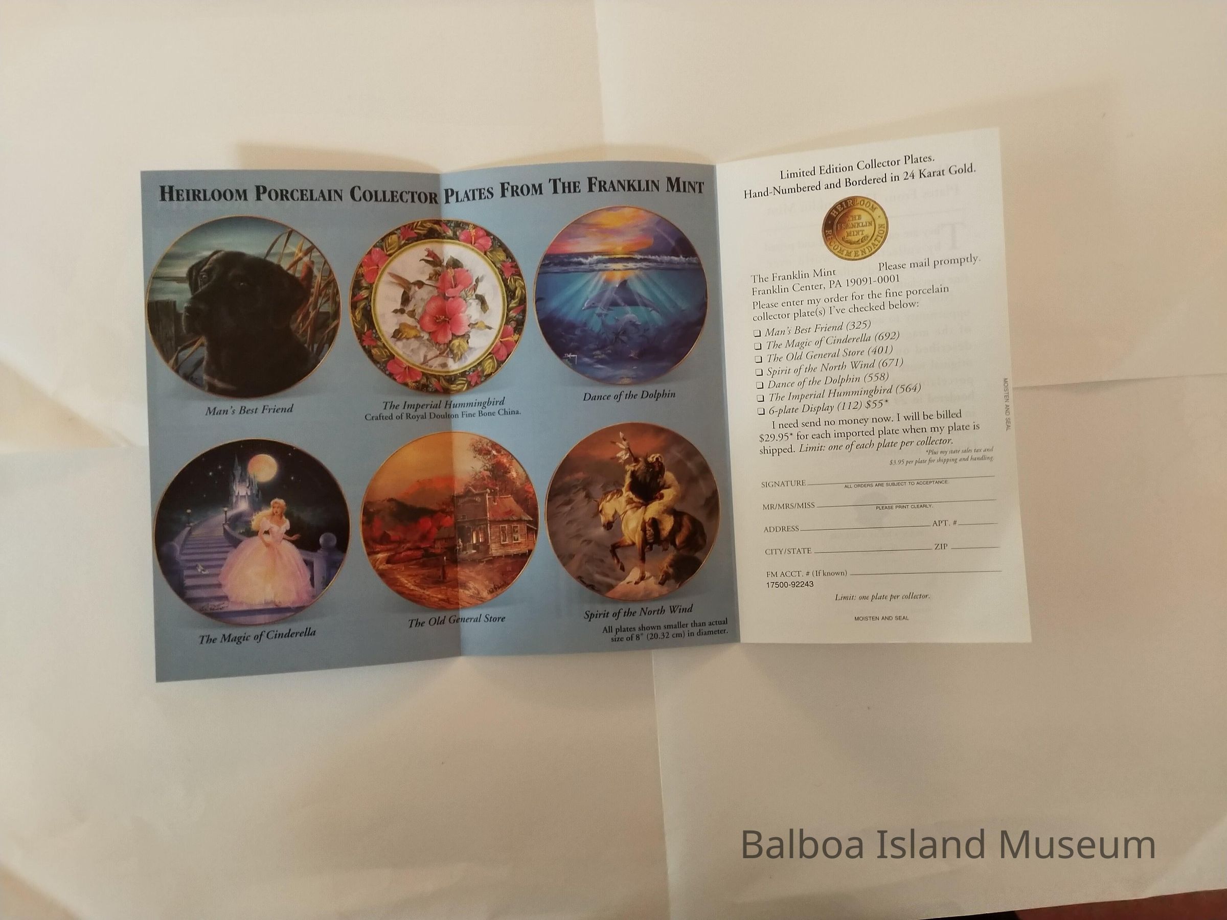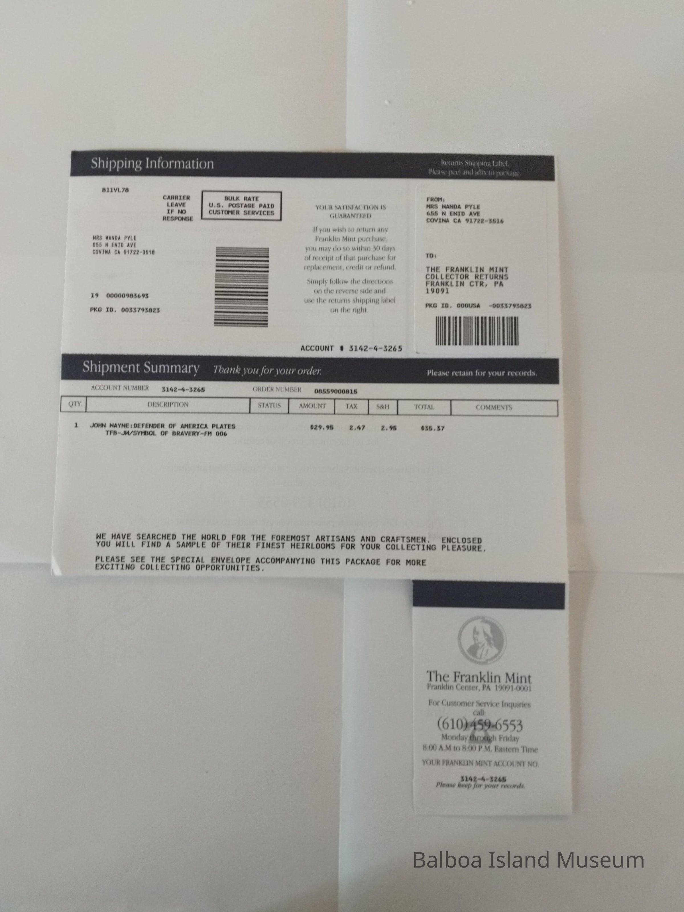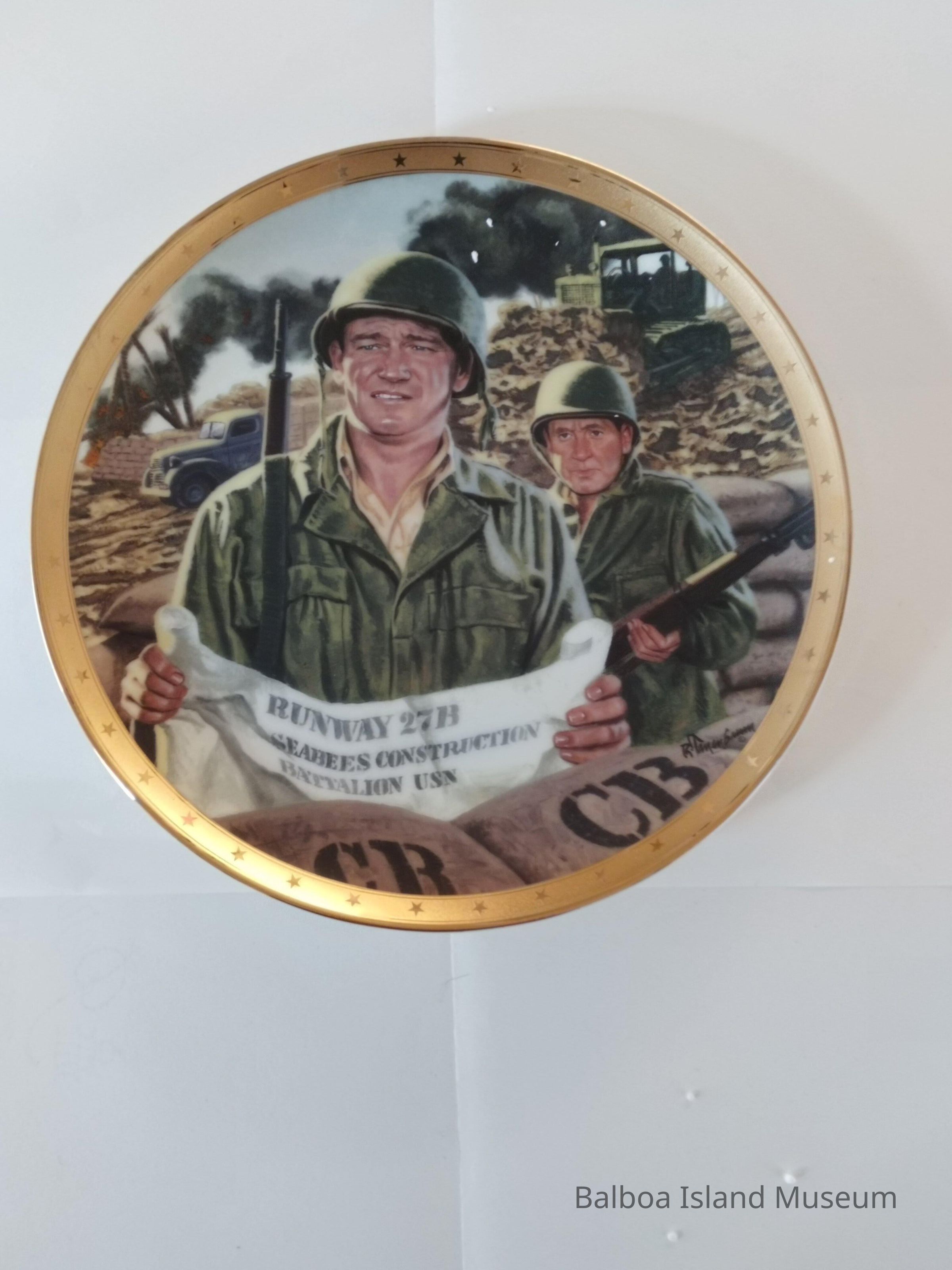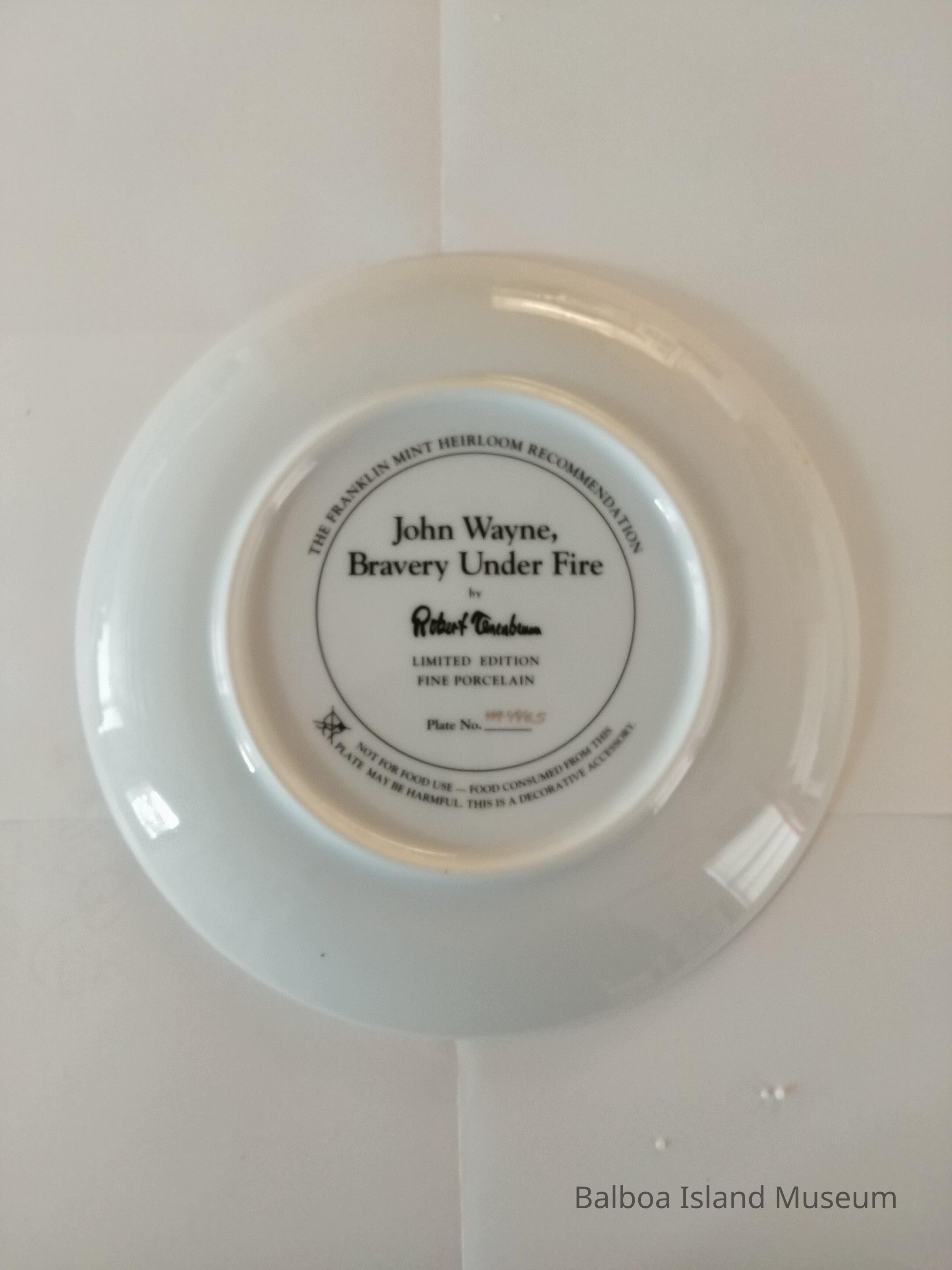A commemorative plate title John Wayne, Bravery Under Fire. It features John wayin waht appears to be World War II military gear and holding a croll that reads Runway 27B Seabees Construction Batalion USN on the back. There is a bulldozer and a truck in back along with a large black plume of smoke. Another military officer is behind him, holding his machine gun. It is rimmed with a gold boarder with stars in embedded in the design. The plate is number YA4465. The plate came iwth a heavy cardboard or plyboard plate stand, A letter from the Franklin Mint who distributed the plate, a oorder form with pricing and retrun slip, A gift registry card, and three other order forms for plates, plate displays, and dolls.Lexicon
