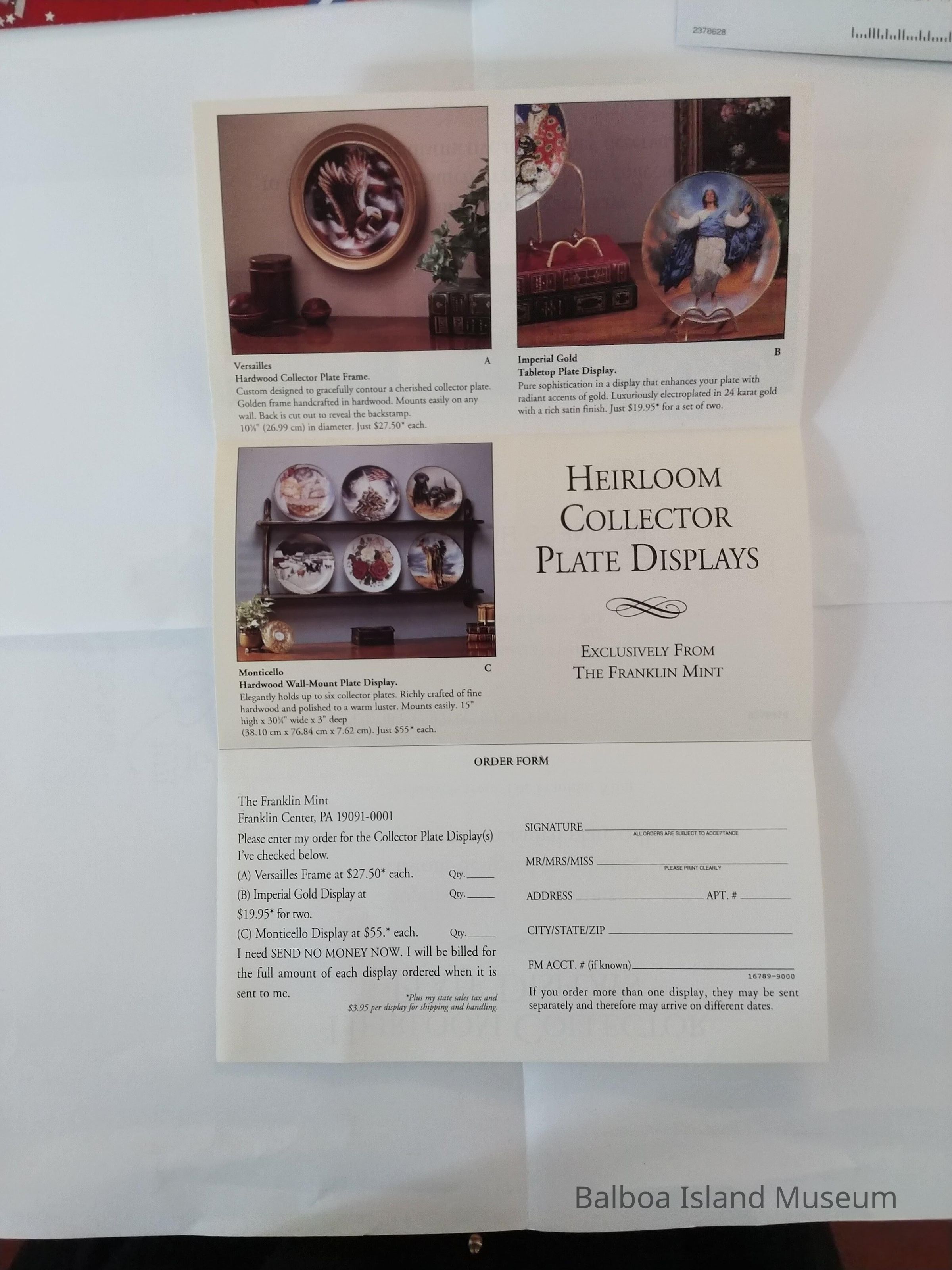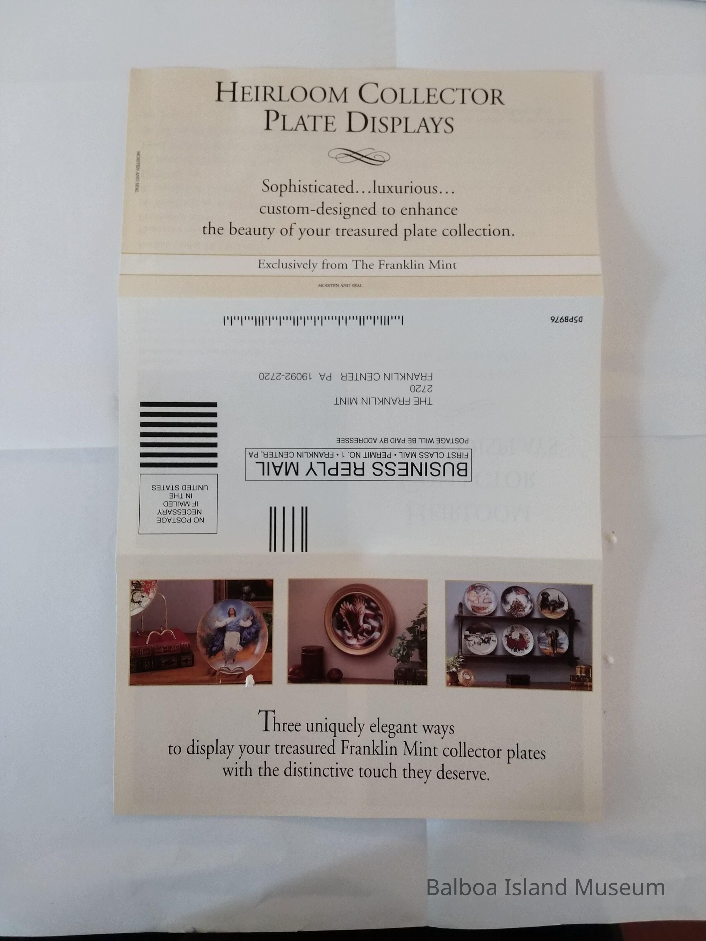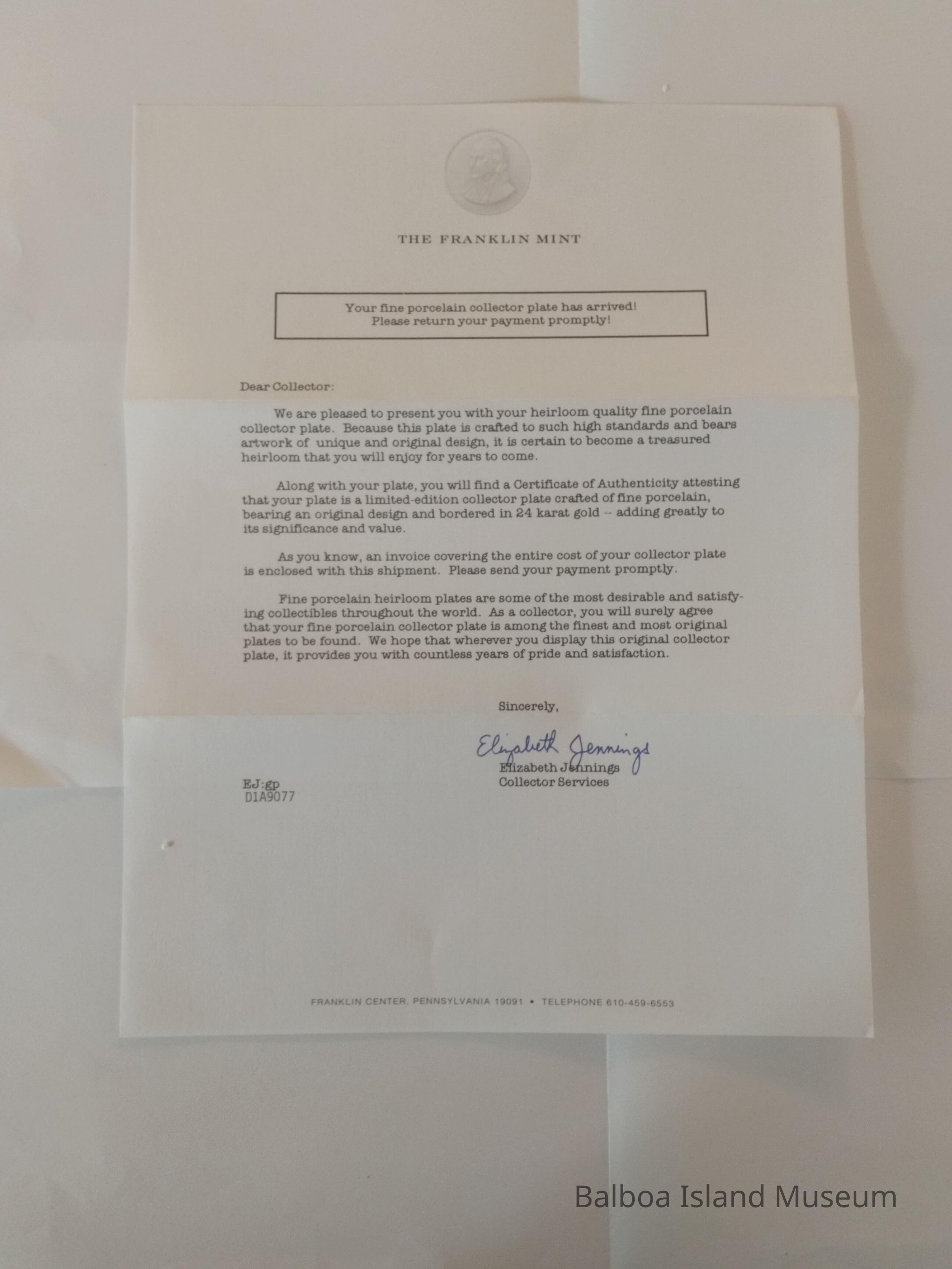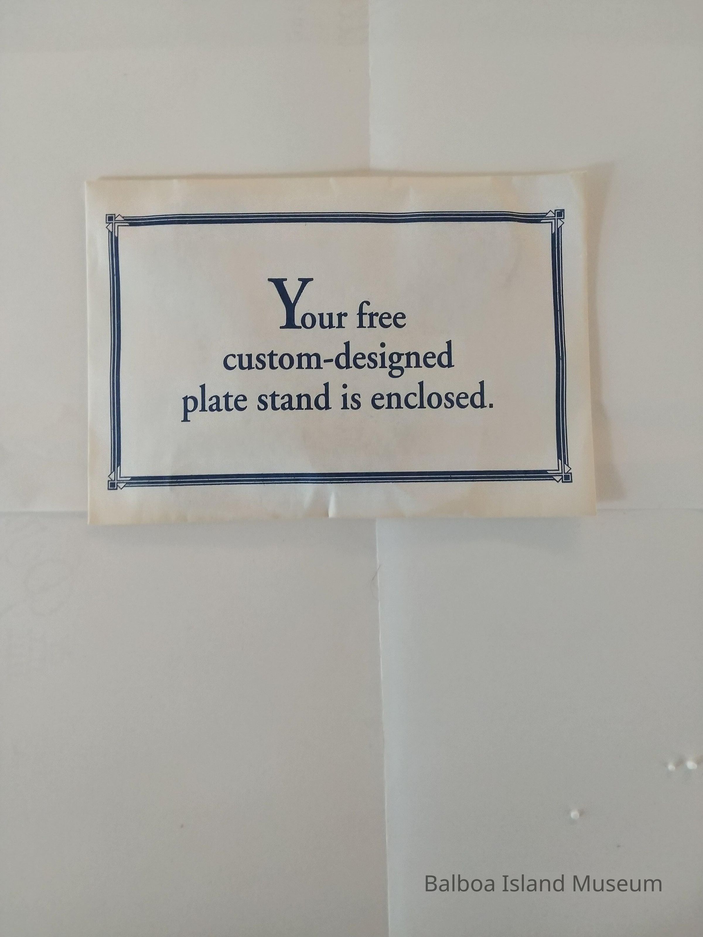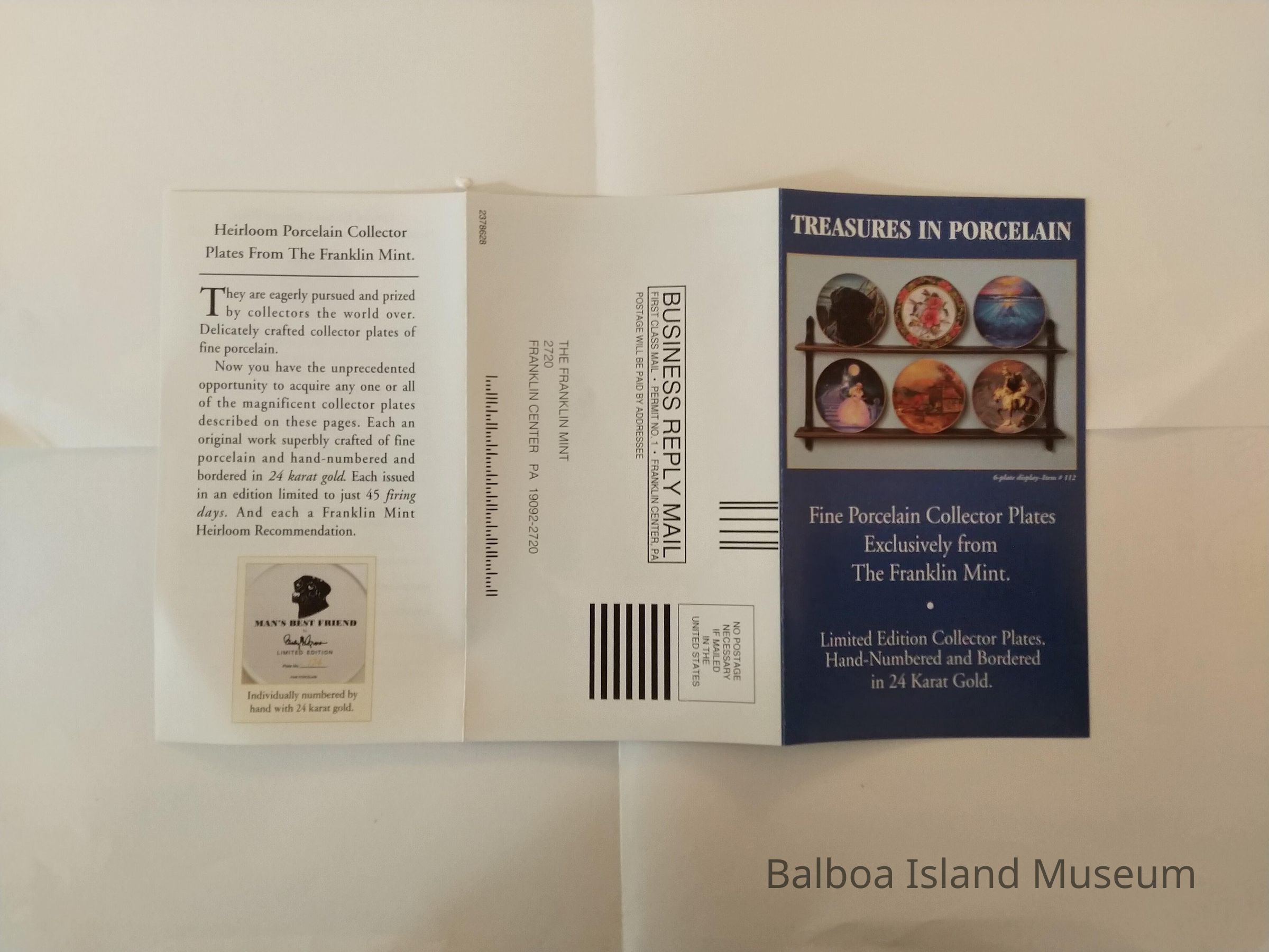 A commemorative plate title John Wayne, Bravery Under Fire. It features John wayin waht appears to be World War II military gear and holding a croll that reads Runway 27B Seabees Construction Batalion USN on the back. There is a bulldozer and a truck in back along with a large black plume of smoke. Another military officer is behind him, holding his machine gun. It is rimmed with a gold boarder with stars in embedded in the design. The plate is number YA4465. The plate came iwth a heavy cardboard or plyboard plate stand, A letter from the Franklin Mint who distributed the plate, a oorder form with pricing and retrun slip, A gift registry card, and three other order forms for plates, plate displays, and dolls.Lexicon