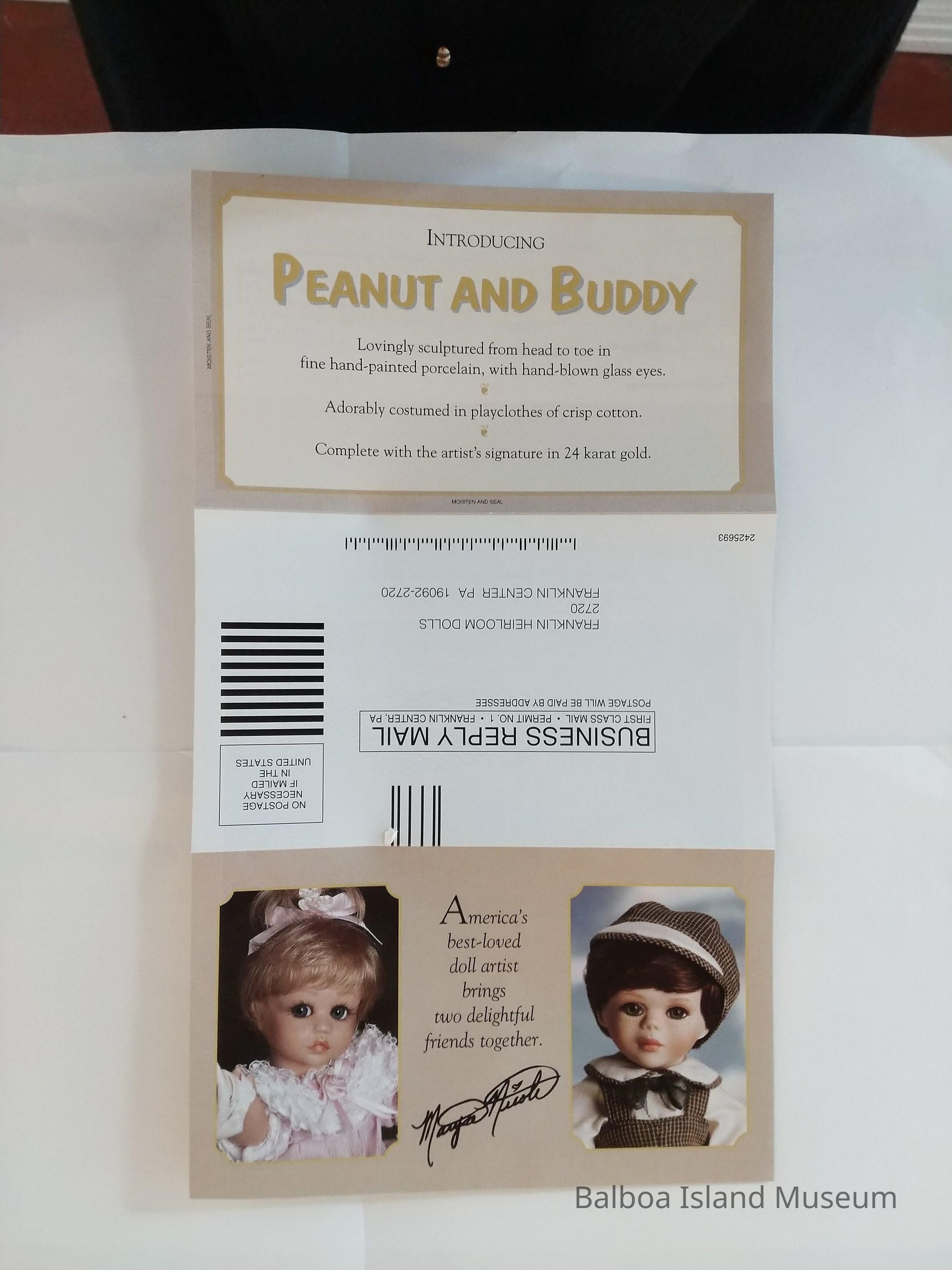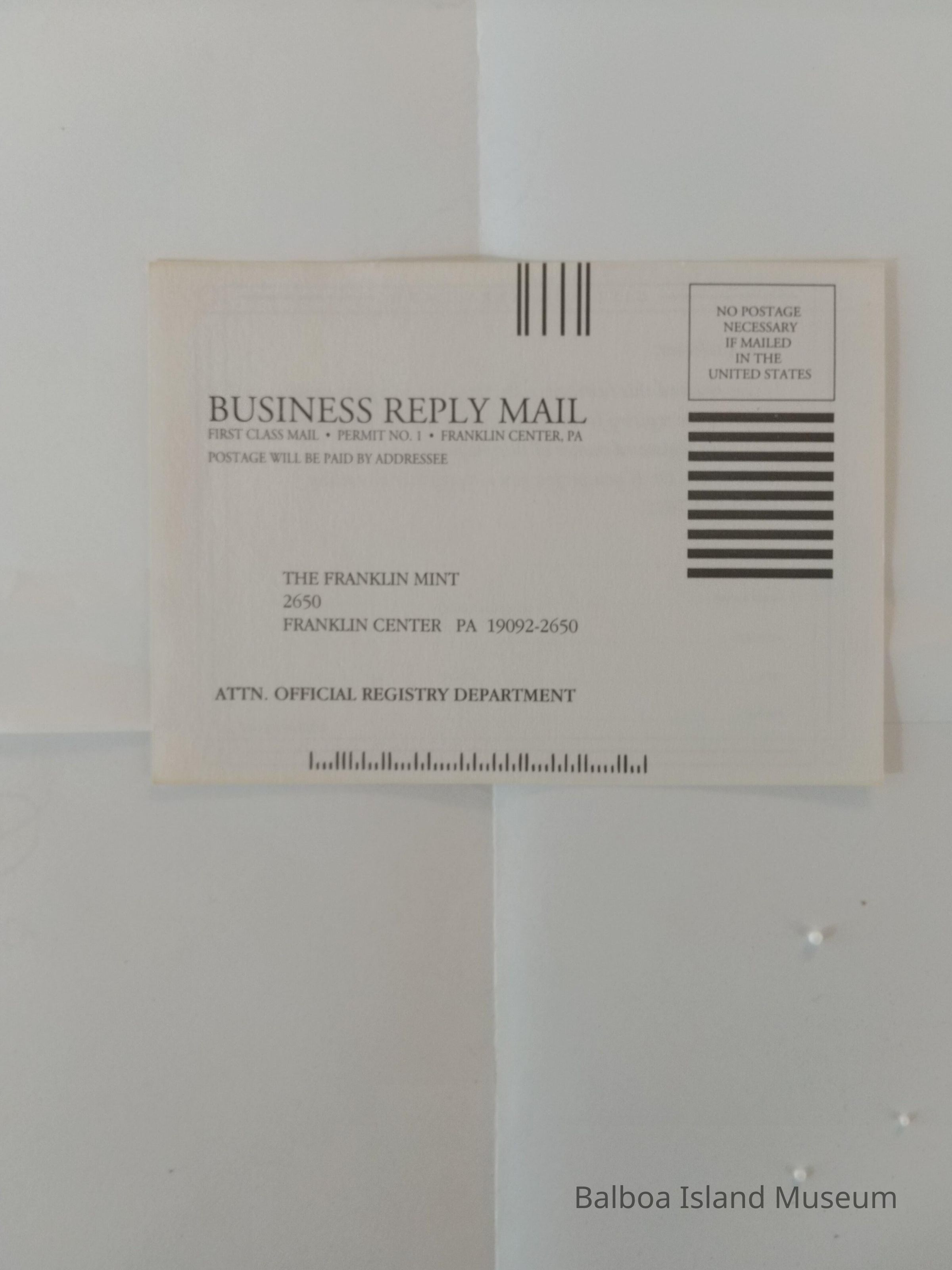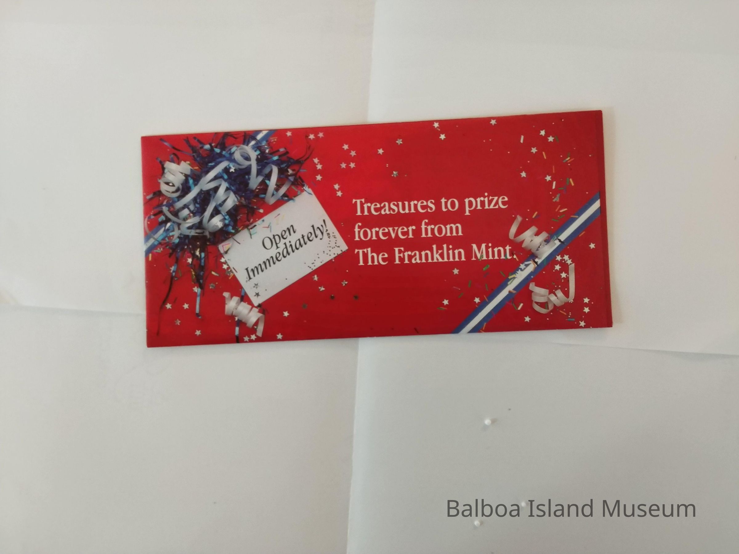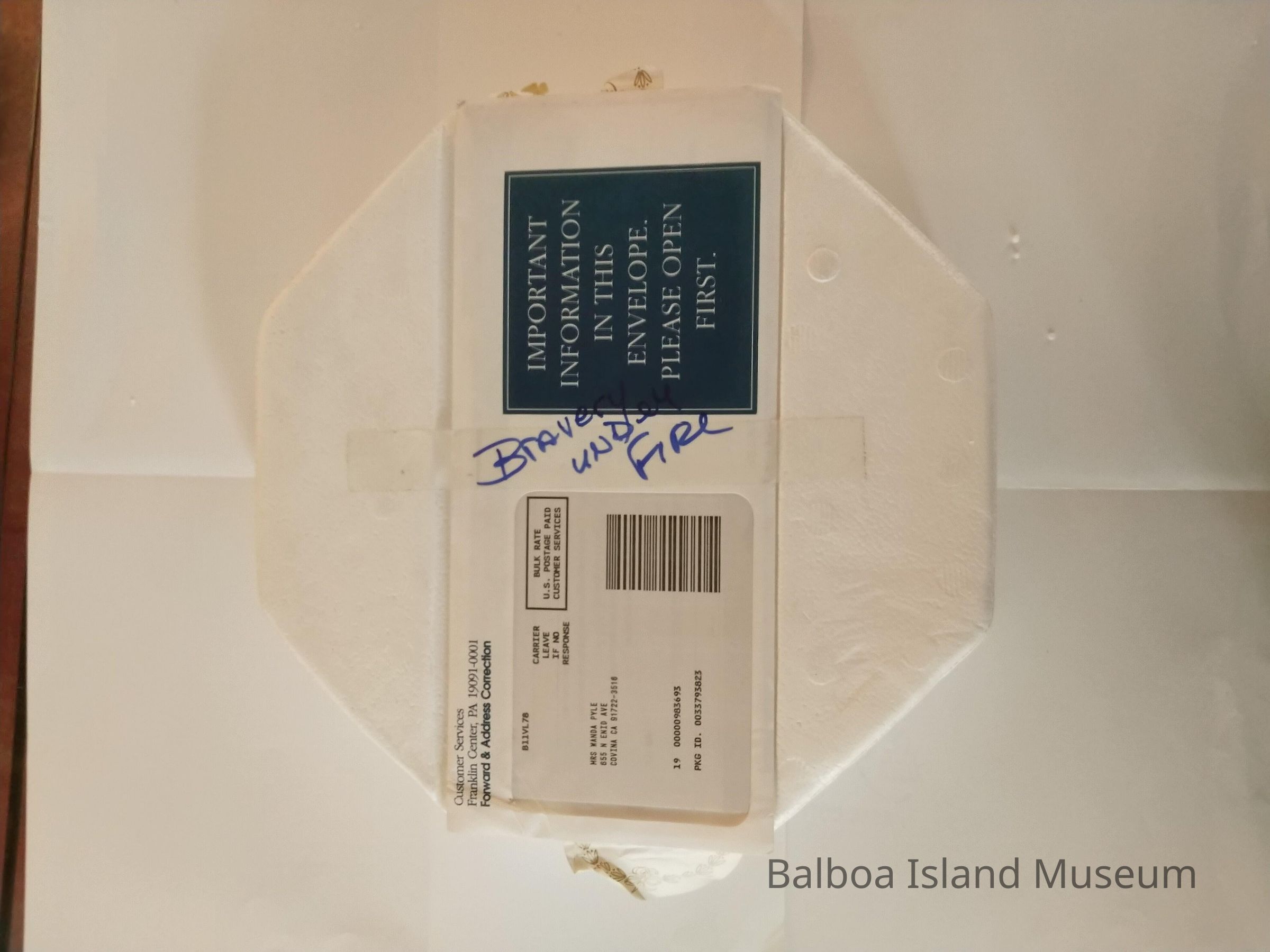 A commemorative plate title John Wayne, Bravery Under Fire. It features John wayin waht appears to be World War II military gear and holding a croll that reads Runway 27B Seabees Construction Batalion USN on the back. There is a bulldozer and a truck in back along with a large black plume of smoke. Another military officer is behind him, holding his machine gun. It is rimmed with a gold boarder with stars in embedded in the design. The plate is number YA4465. The plate came iwth a heavy cardboard or plyboard plate stand, A letter from the Franklin Mint who distributed the plate, a oorder form with pricing and retrun slip, A gift registry card, and three other order forms for plates, plate displays, and dolls.Lexicon