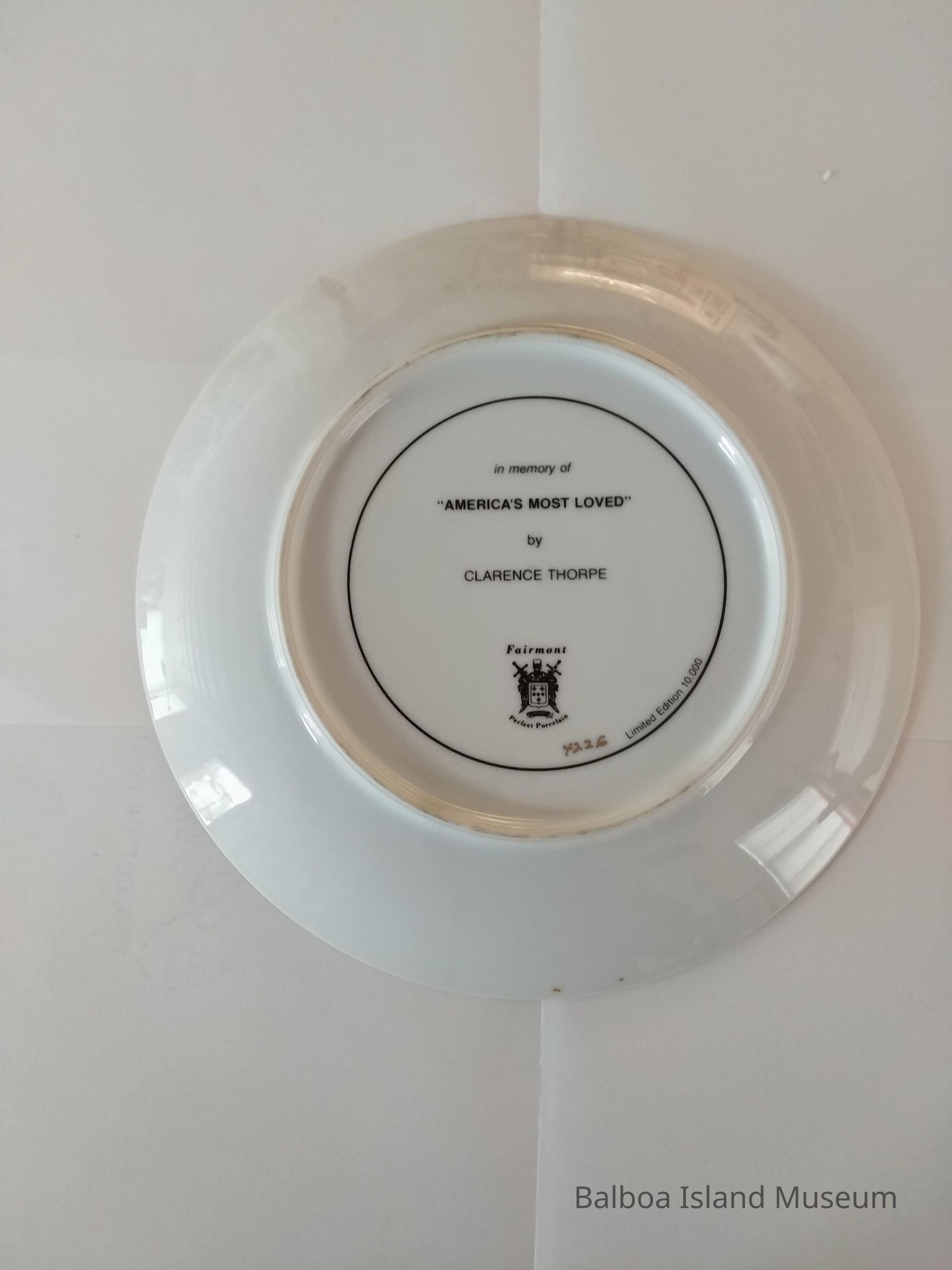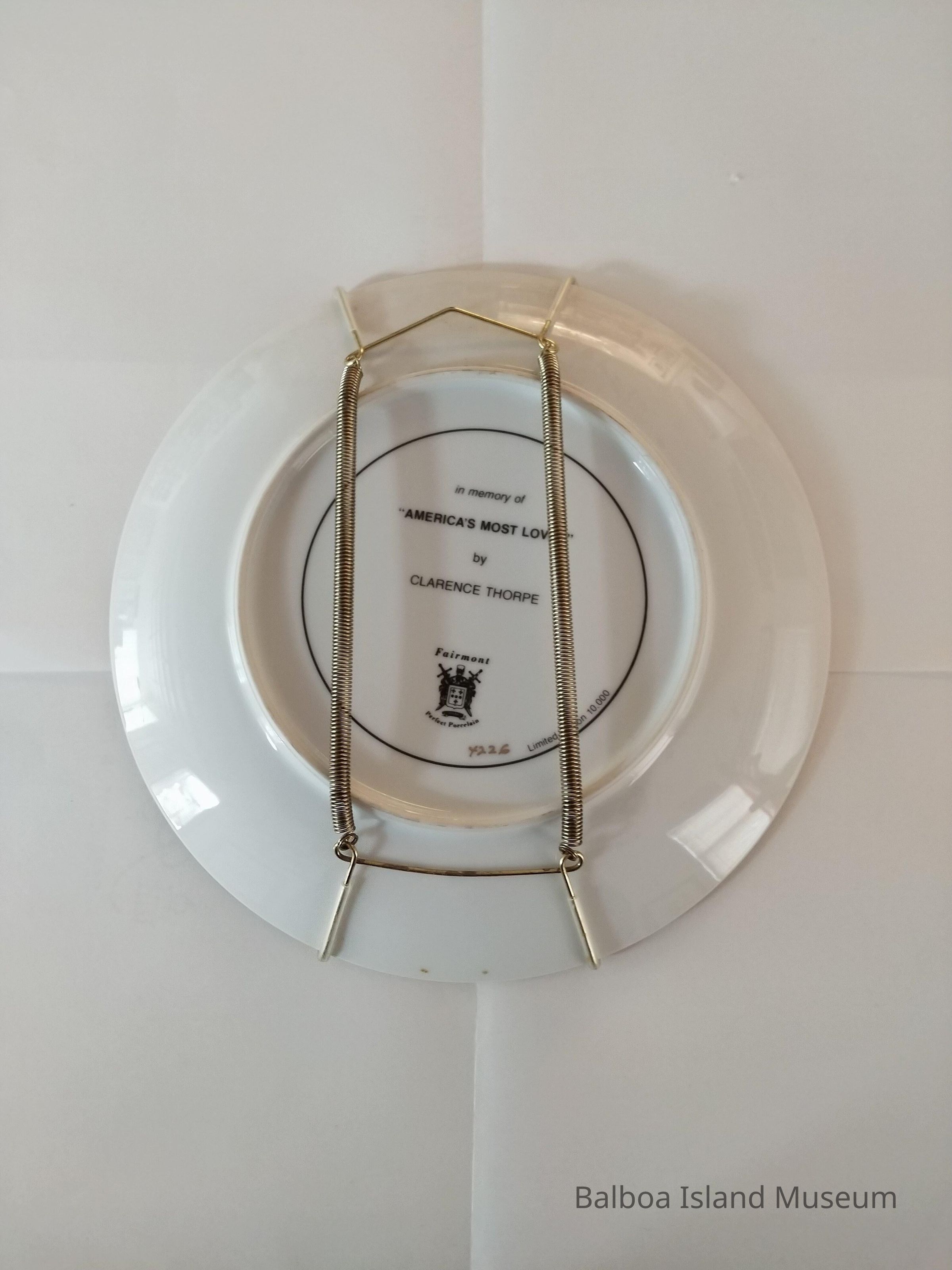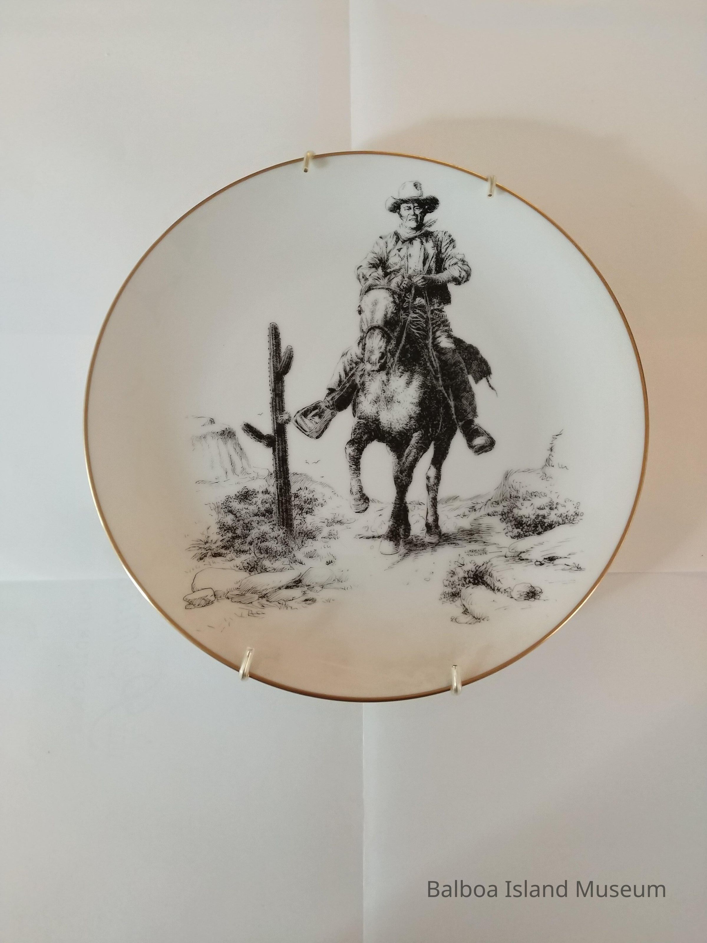 A commemorative plate titled "America's Most Loved" and distributed or made by Fairmont. The plate features an image of John Wayne on horseback in the desert in balck and white in-style sketching. The plate is rimmed in gold. The plate number of 4226 out of 10,000. It includes a metal hanging plate holder.Lexicon