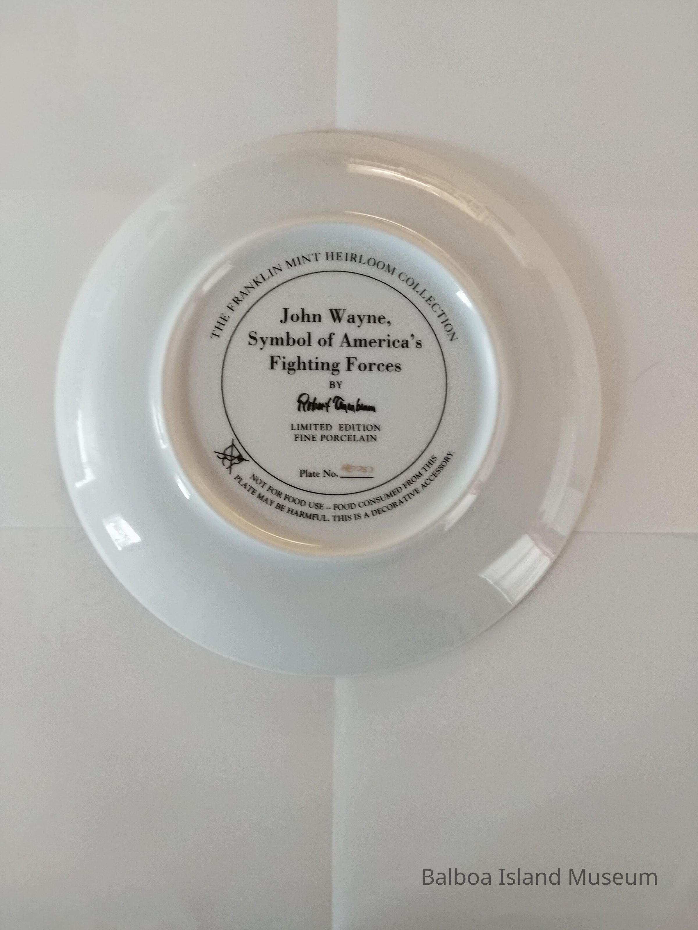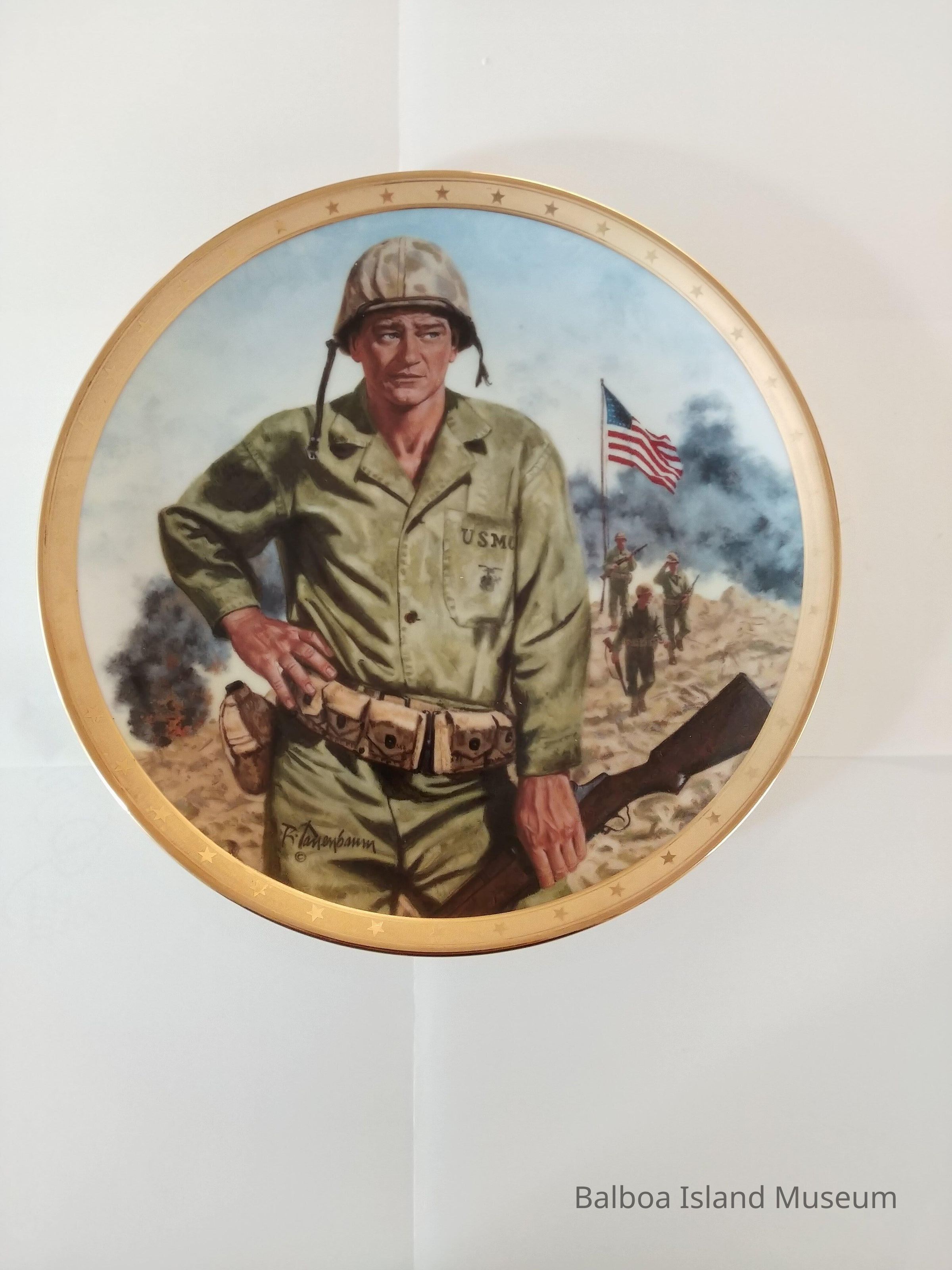 A commemorative plate issued byt the Franklin mint and designed by Robert Tanenbaum featuring John Wayne. He is dressed in a Marine uniform on the front, with men walkin about behind him undr an american flate with smoke in the sky. The plate is number HE1757. The lid is stamped with B11UJ88.Lexicon