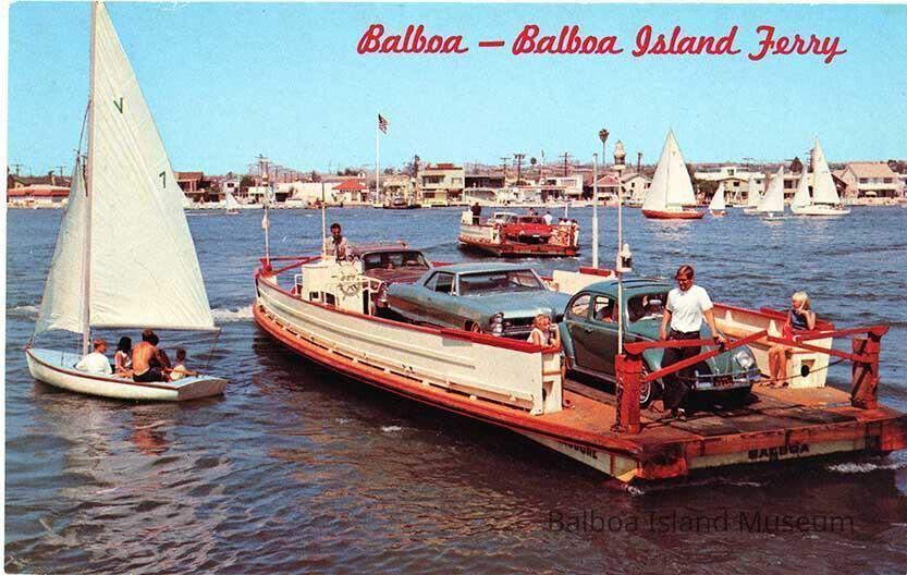 A photograph postcard featuring an image of the Balboa Island Ferry Commodore crossing the Newport Harbor. It has just left the Fun Zone in the photograph and there is a sailboat immediately beside it with four occupants. Circa 1970s. A short blurb is on back. Made by H. S. Crocker Co.