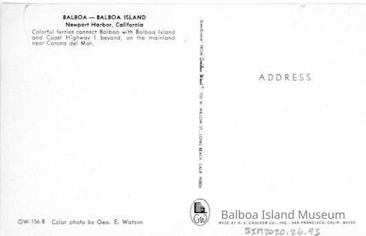 Published by Golden West in Long Beach. Printed by H. S. Crocker Co., Inc in San Francisco. Photograph by George E. Watson. Postcard number GW-156-B.Subject