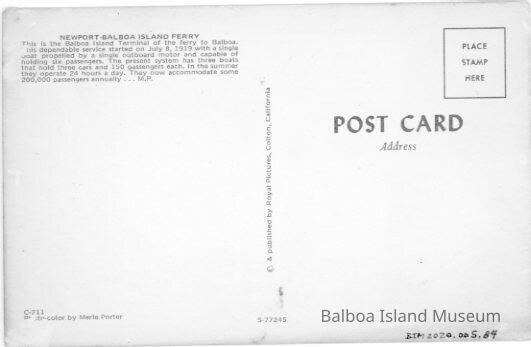 Never sent. There is a small blurb on the back about the Balboa Island Ferry. Published by Royal Pictures. Photographed by Merle Porter. Postcard number C-211 and S-77245.Subject