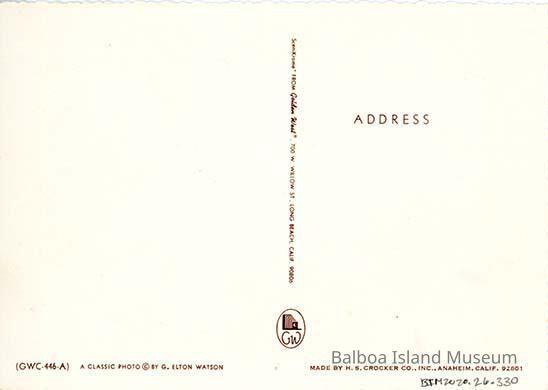 Unused. Divided back. Published by Golden West in Long Beach, printed by H, S. Crocker Co., Inc in Anaheim. Photograph by George Elton Watson. Postcard number GWC-446-A.Subject