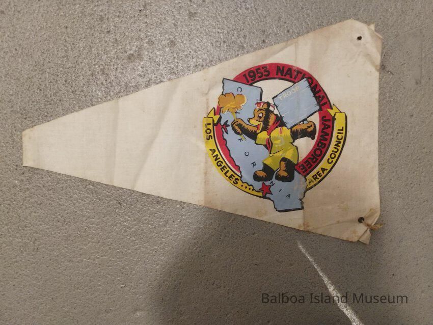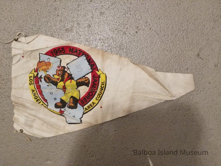Two flags used at the Boy Scout Jamboree of 1953 to denote where the troops for LA were to camp. There is a beary in a scout uniform holding a golden poppy (state flower) and a sign that reads "Troop" where the troop number could be written. A yellow ribbon along the bottom of the design reads "Los Angeles.... Area Council" while a red circle behind the bear and the state of California reads "1953 National Jamboree". Only one of the flags has the troop number written on it. It is for Troop number 5. The flags are triangular and have metal reenforced holes in the corners for string ties to attach them to poles.Lexicon