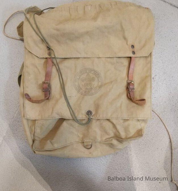 A backpack mae for the boy scouts. The bag was made of a gree canvas with dark green canvas straps and a tag on the back reading: Property of. There are lines beneath for the scout to write their name and troop information. RIngs on the side of the bag allowed it to be attached to boards if necessary for carrying purposes. One of the straps also detatches at a clip on the bottom. The inside is extremely large and there is a pouch in the top flap of the bag with straps holding it closed. This was an easy access pouch.Made/Created