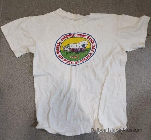 A white t-shirt with the national jamboree of 1953 logo on the front. It reads: National Jmamboree Irvine Ranch Calif. Boy Scout of America 1953. Size large, faded with age.Made/Created