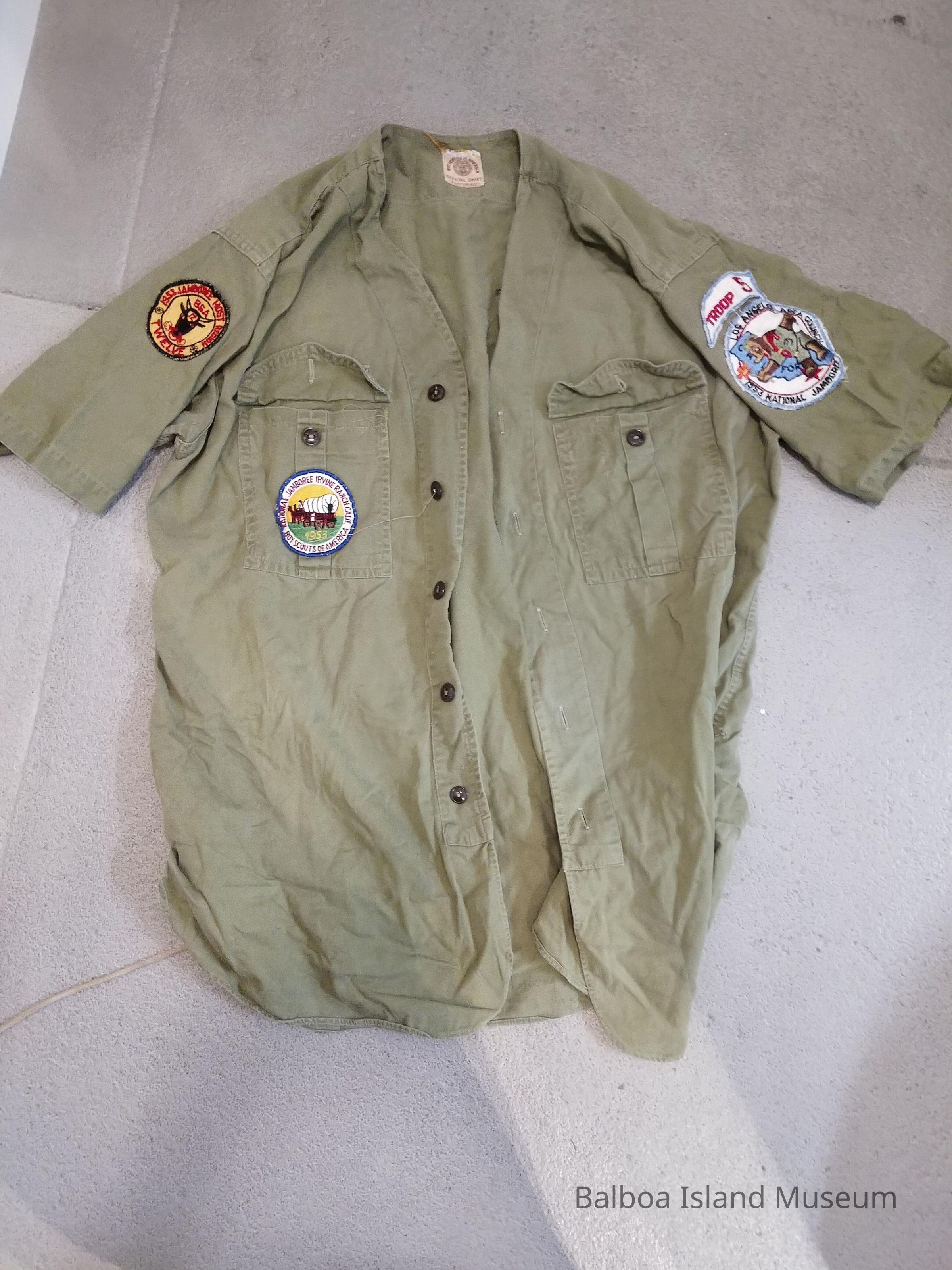 A button up uniform shirt for a boy scout. The shirt is green with a series of different badges on the arms and left pocket. A badge above the left pocket reads Boy Scouts of America. The badges are one for the jamboree, on for being from the host region for the Jamboree, and a pair that go together for the LA area council (jamboree specific) and troop number. The first is on the left sleeve, the second on the left side pocket, and the final pair are on the right sleeve. This was likely a special uniform shirt made for the Jamboree.Use