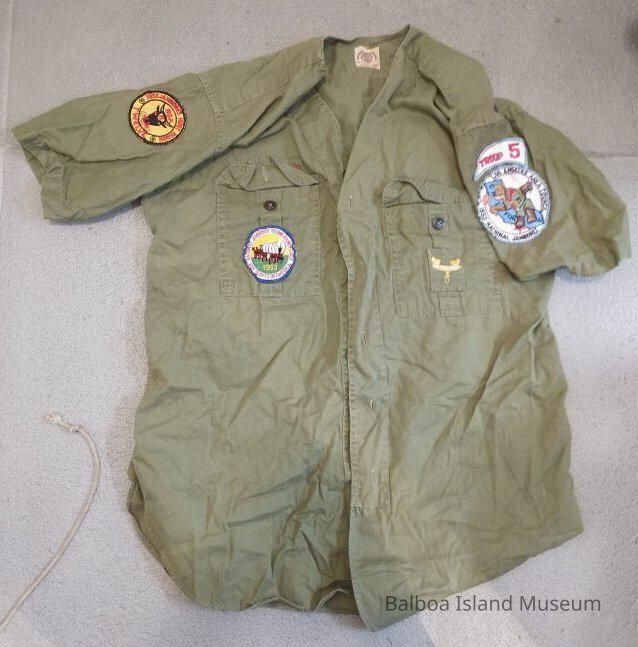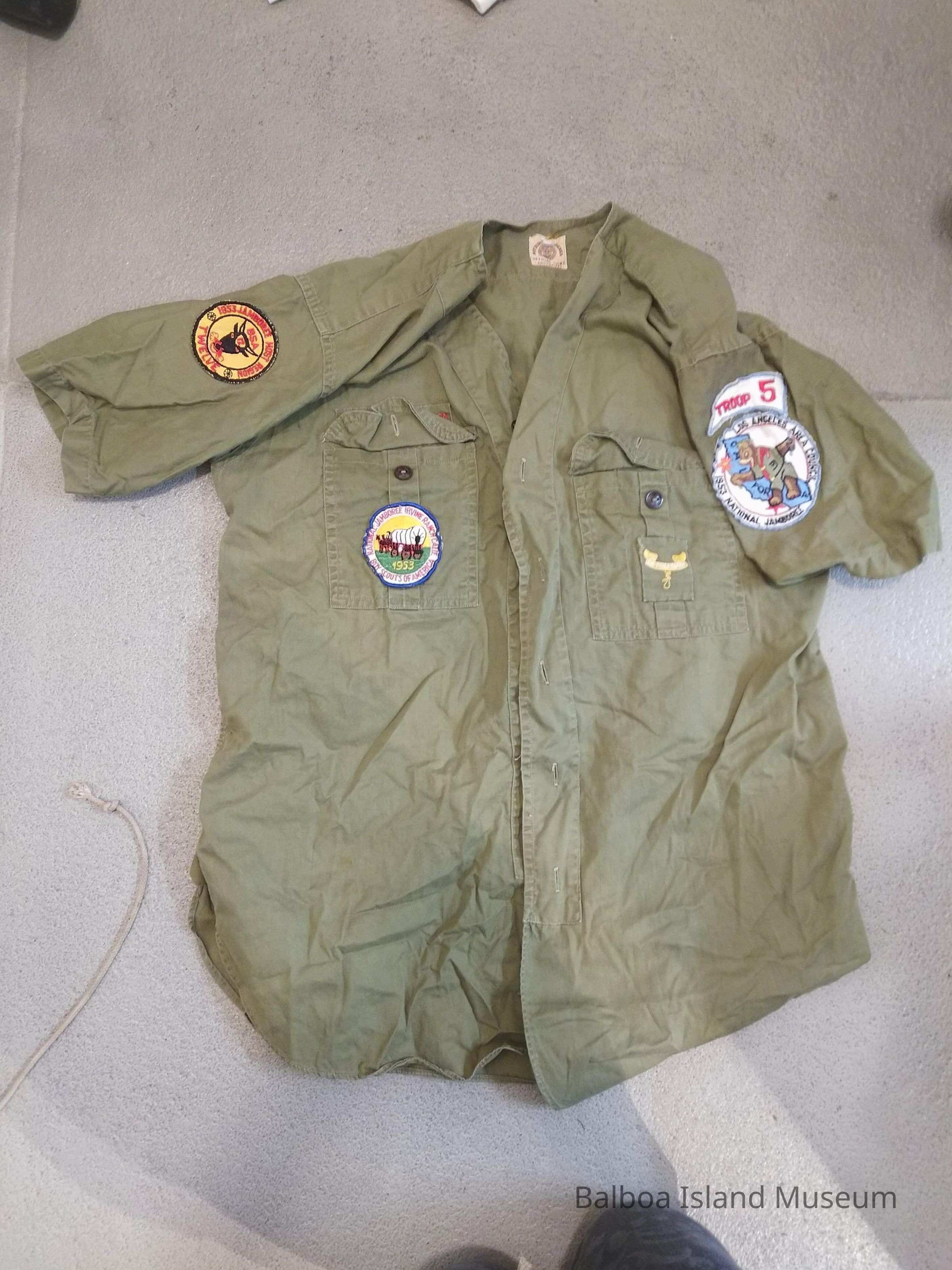 A button up uniform shirt for a boy scout. The shirt is green with a series of different badges on the arms and pockets. A badge above the left pocket reads Boy Scouts of America. The badges are one for the jamboree, one for being from the host region for the Jamboree, one that simply says "Be Prepared", and a pair that go together for the LA area council (jamboree specific) and troop number. The first is on the left sleeve, the second on the left side pocket, the third on the right side pocket, and the final pair are on the right sleeve. This was likely a special uniform shirt made for the Jamboree. This shirt is nearly identical to the first save the "Be Prepared" badge.Made/Created