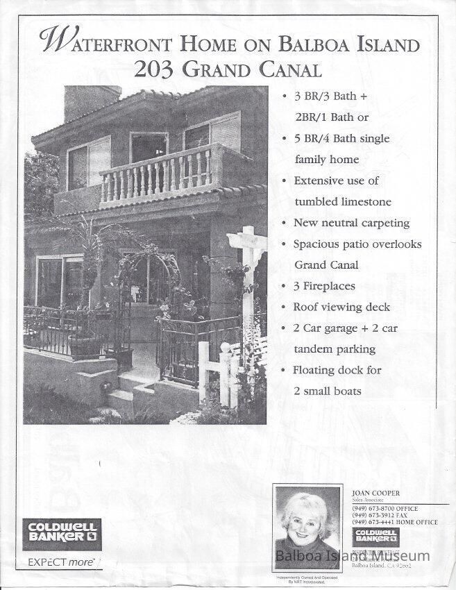 Advertisement for home for sale at 203 Grand Canal. Black and white. Map on reverse with some writing on it. Listed by Joane Cooper at Caldwell RealtyLexicon