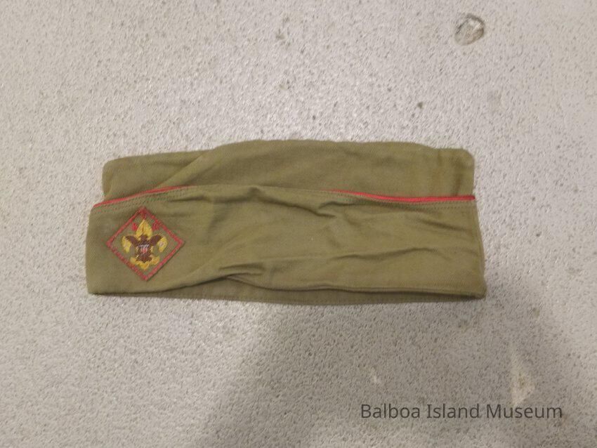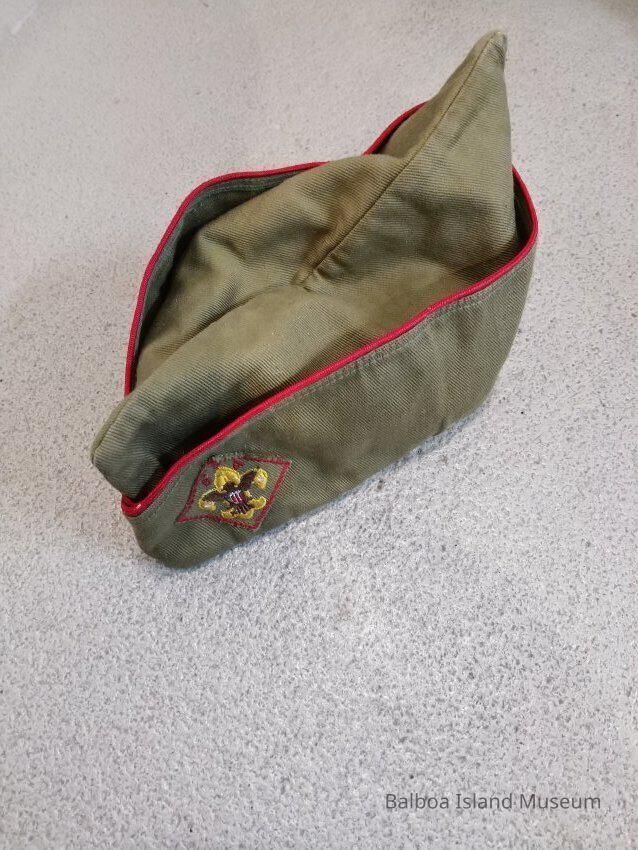 Two scout uniform hats made by the Boy Scouts of America. The hats are green with a red edge and a diamond shaped badge with the Boy Scout symbol on it.