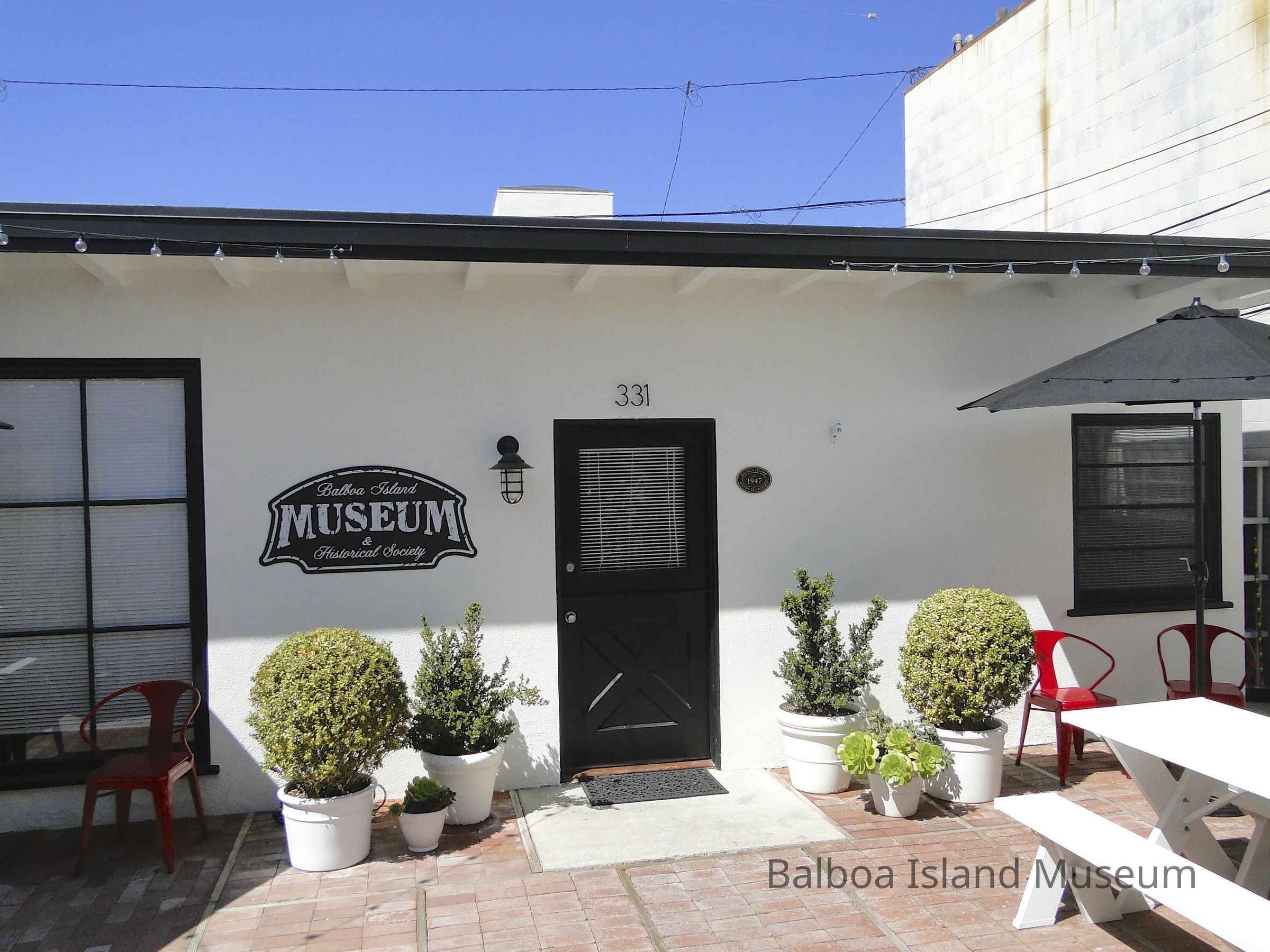 Color photo in front of home at 331 Marine Avenue featuring the Museum's logo and patio setup.Photograph Details