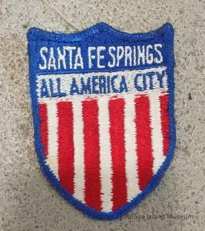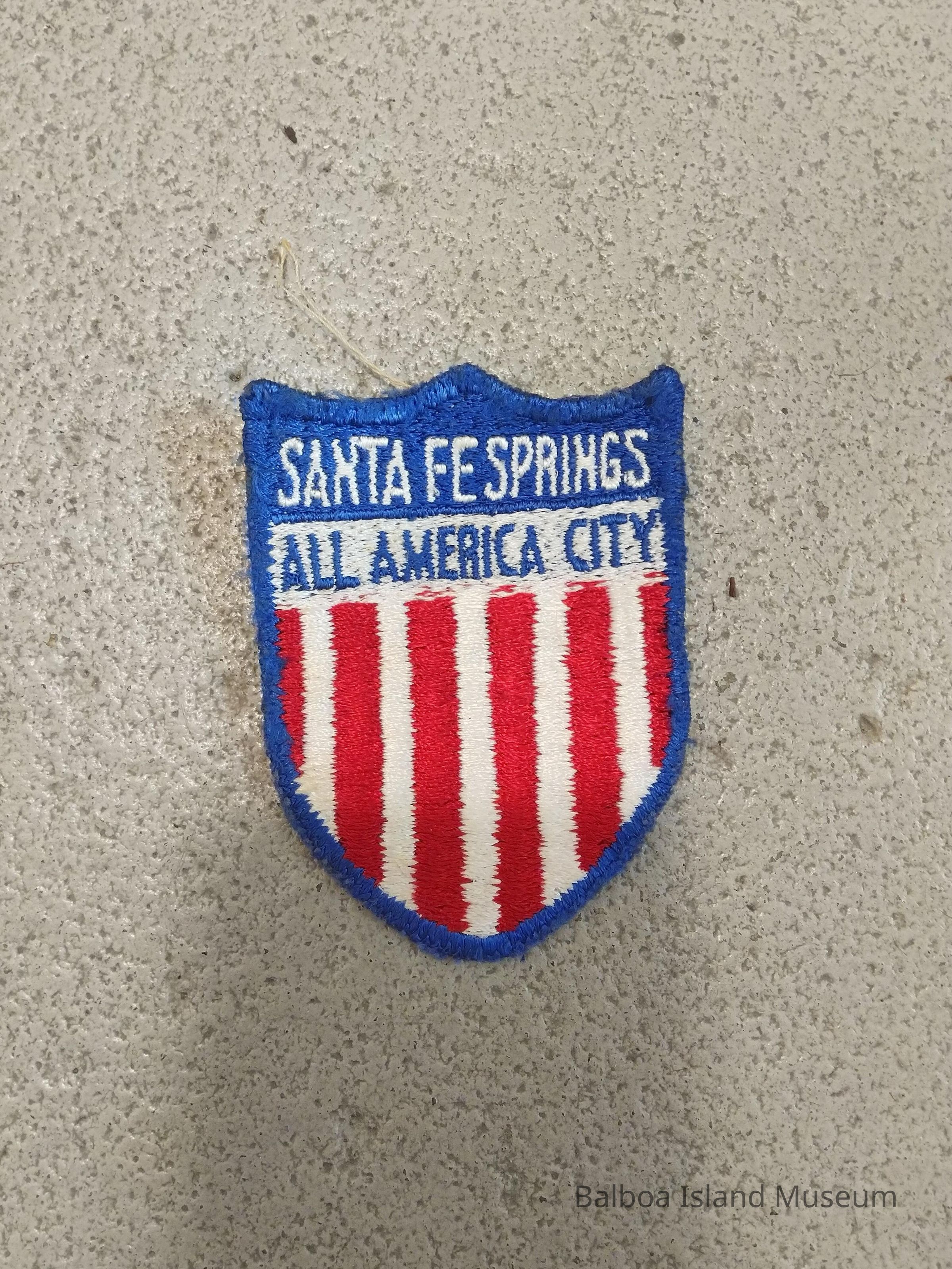 A badge shaped like a shield with the words "Santa Fe Springs ALl America City on the top. The bottom has a series of red and white stripes like the US flag. the top of the badge and border stitching are done in blue.